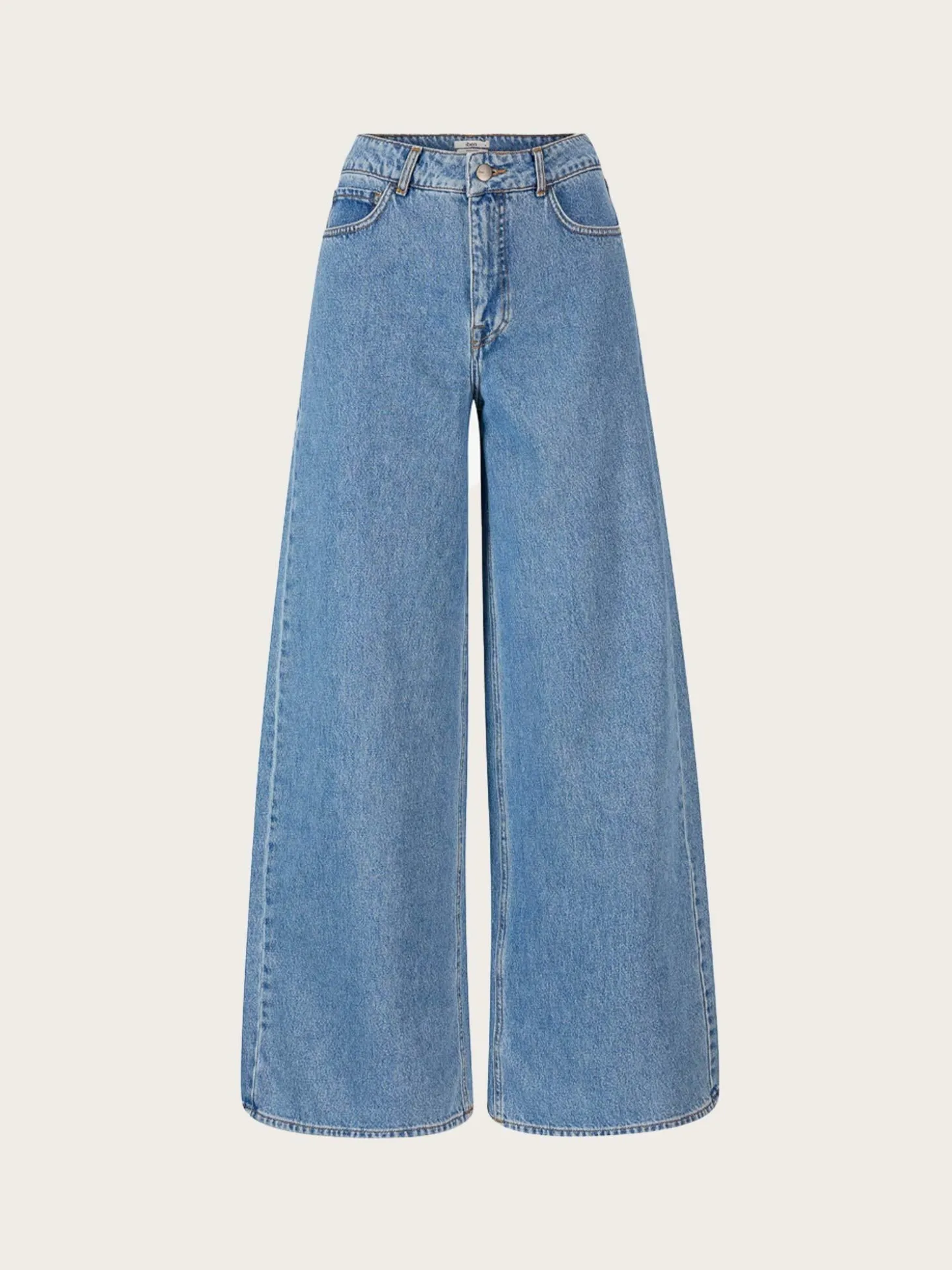 En jeans med høy midje, laget av 100 % bomull som gir komfort og pusteevne hele dagen. Jeansen fremhever silhuetten og har et vidt beinsnitt som gir moderne vri.