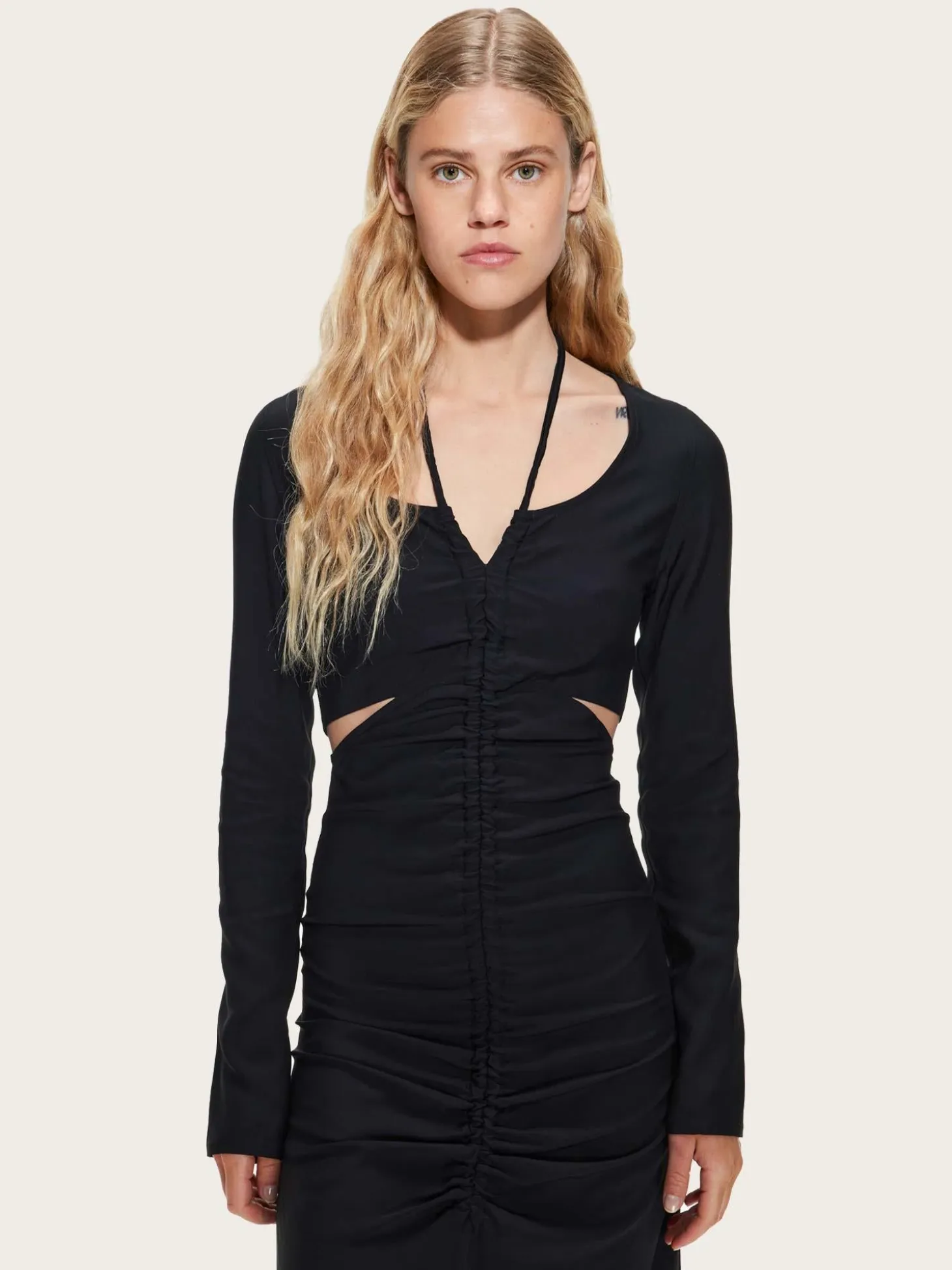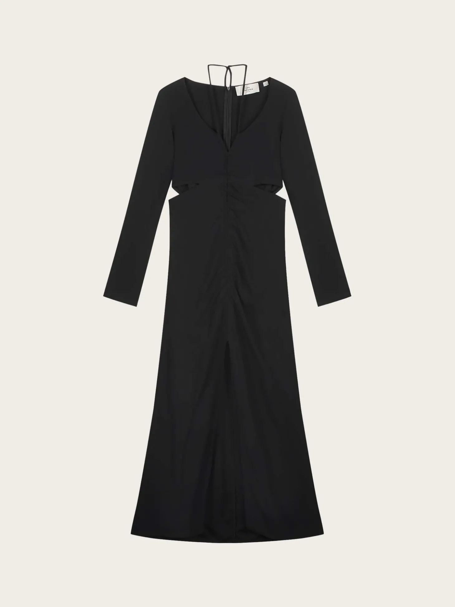Resort-style Fluid Dress fra Les Coyotes de Paris. En nydelig lang kjole, med lekre cut-out detaljer i midjen. Den har utringning med snøring rundt halsen, lange ermer og splitt i front. Kjolen har dekorative draperinger i front.