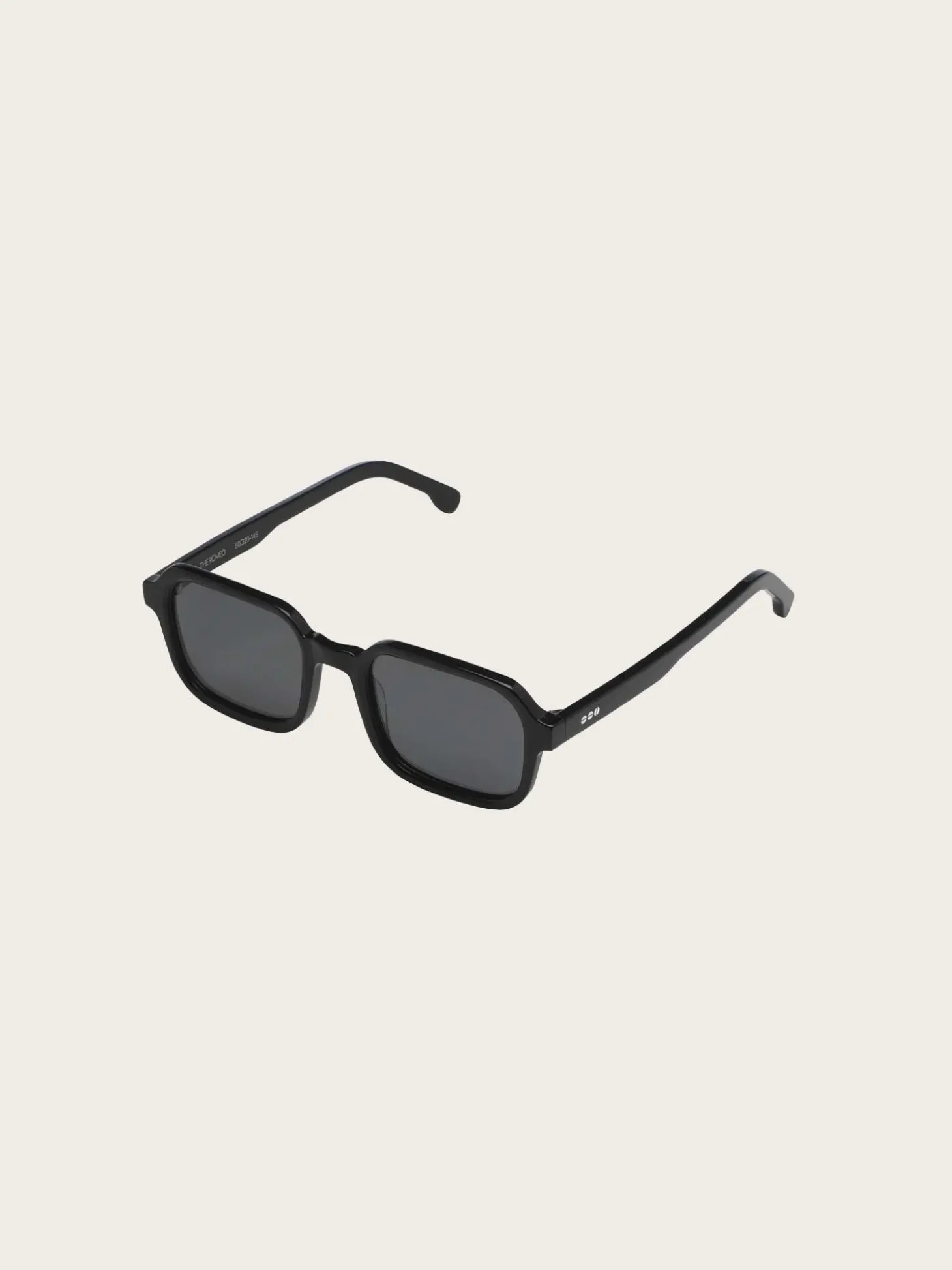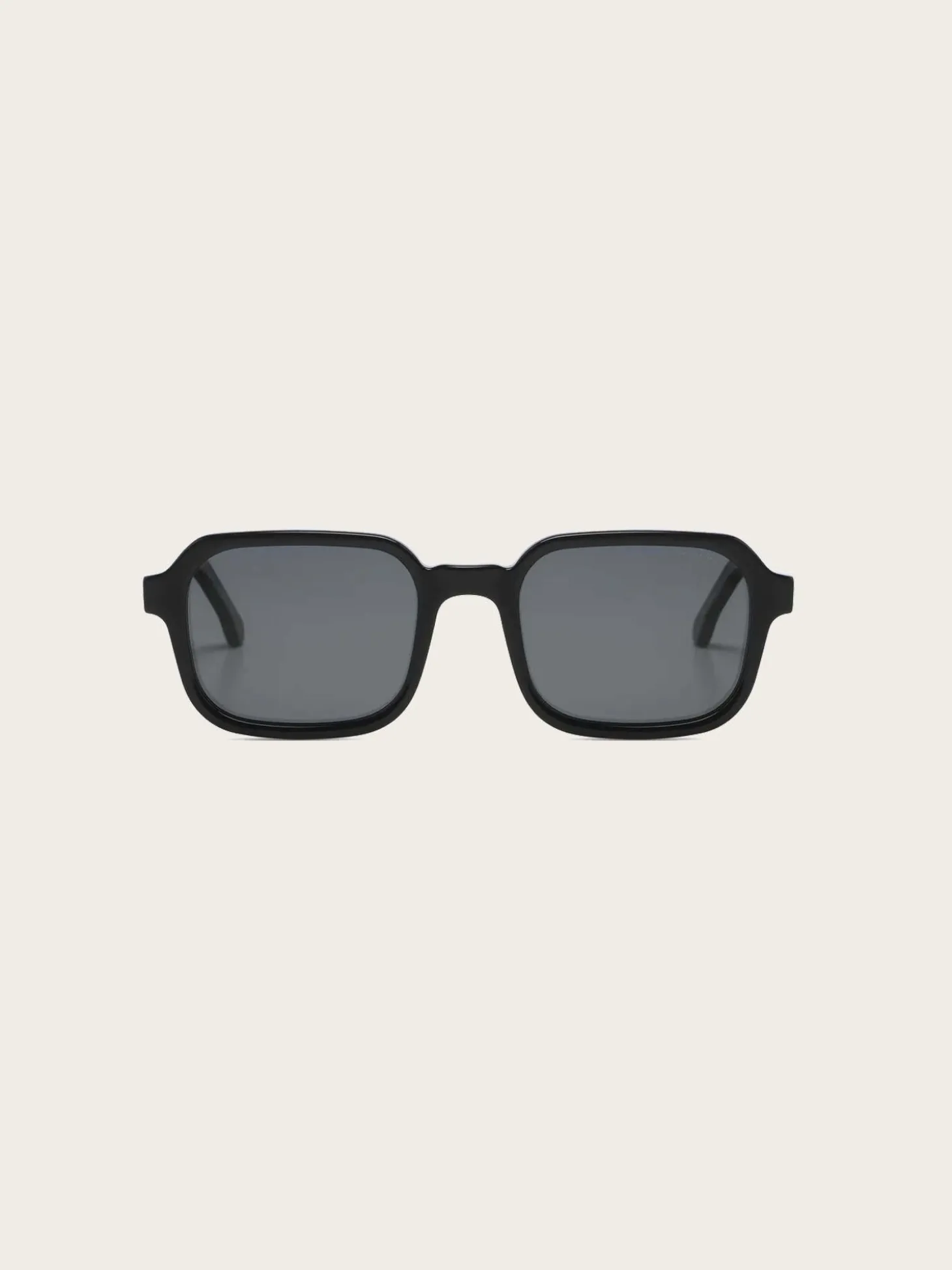 En retro-inspirert solbrille med sort innfatning og mørke glass. Brillene har størrelsen 13,6 x 4,4 mm på rammen, med 100% UV400 beskyttede, ripebestandig glass. Pusseklut og etui medfølger.