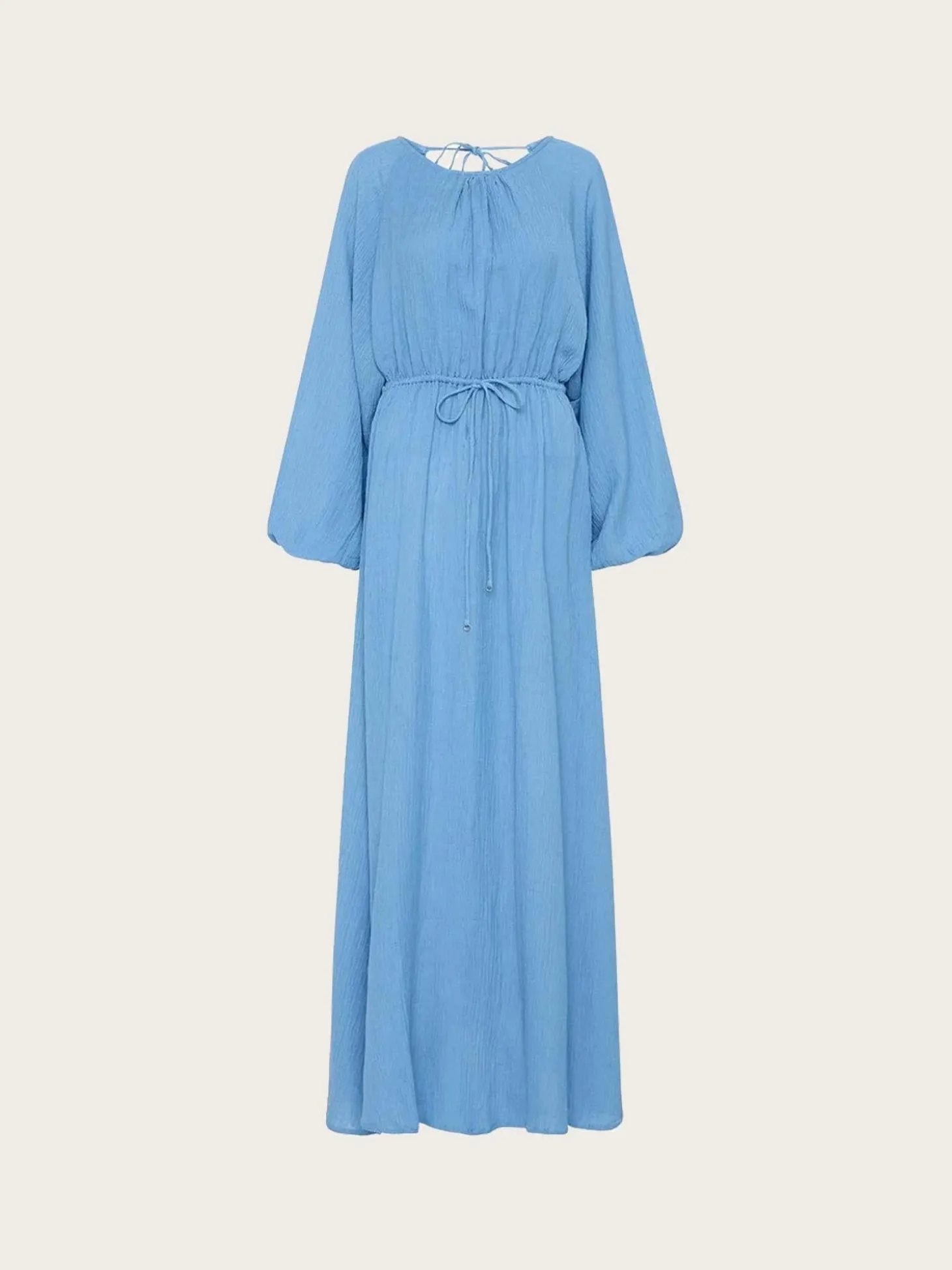 En lang og deilig maxikjole i en nydelig farge. Den har lange voluminøse ermer, åpen rygg med knytedetaljer og en elastisk snøring i midjen.