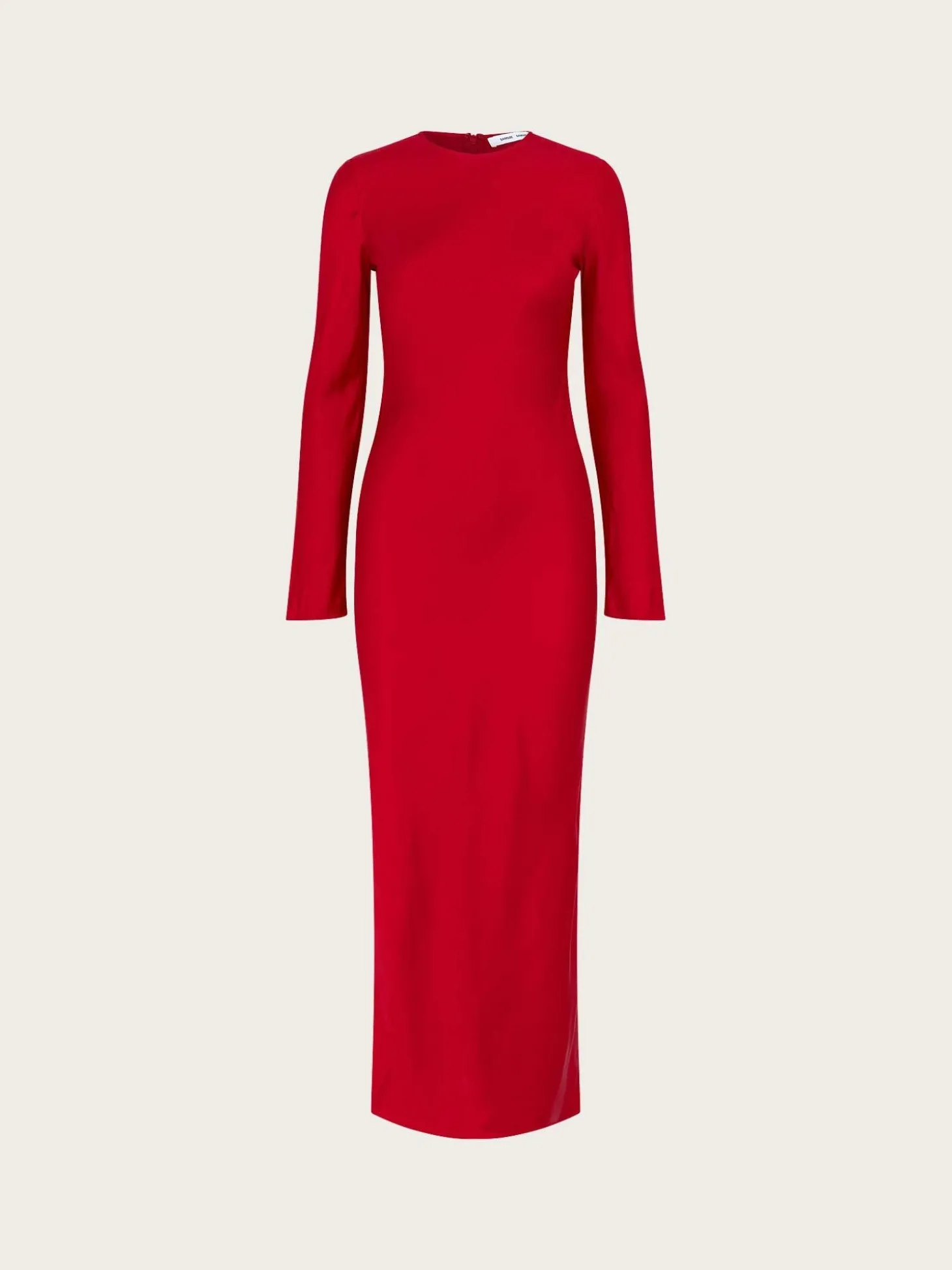 En nydelig rød kjole i sateng. Den har rund hals, lange ermer og lang lengde. Perfekt for sesongenes festligheter.