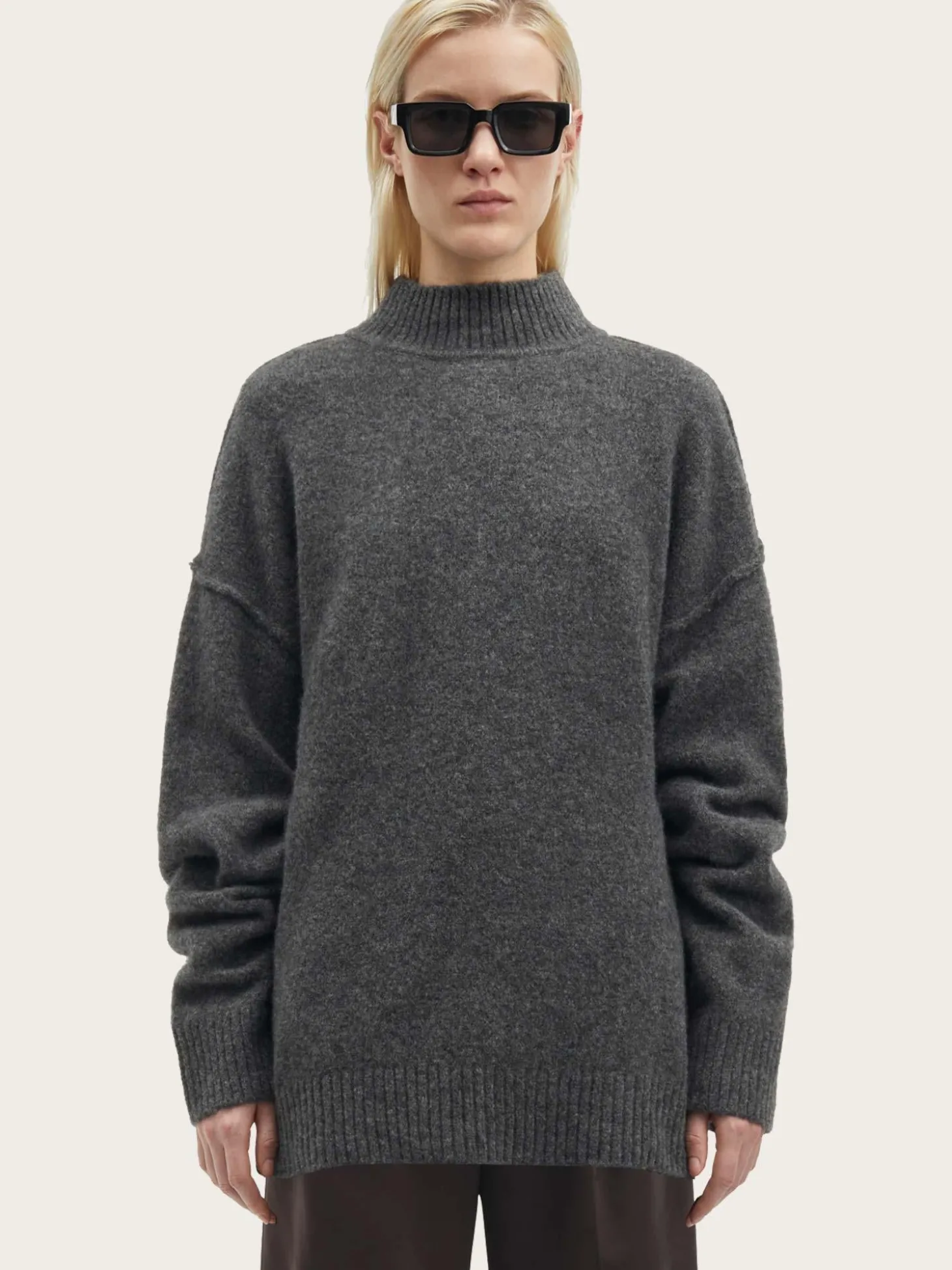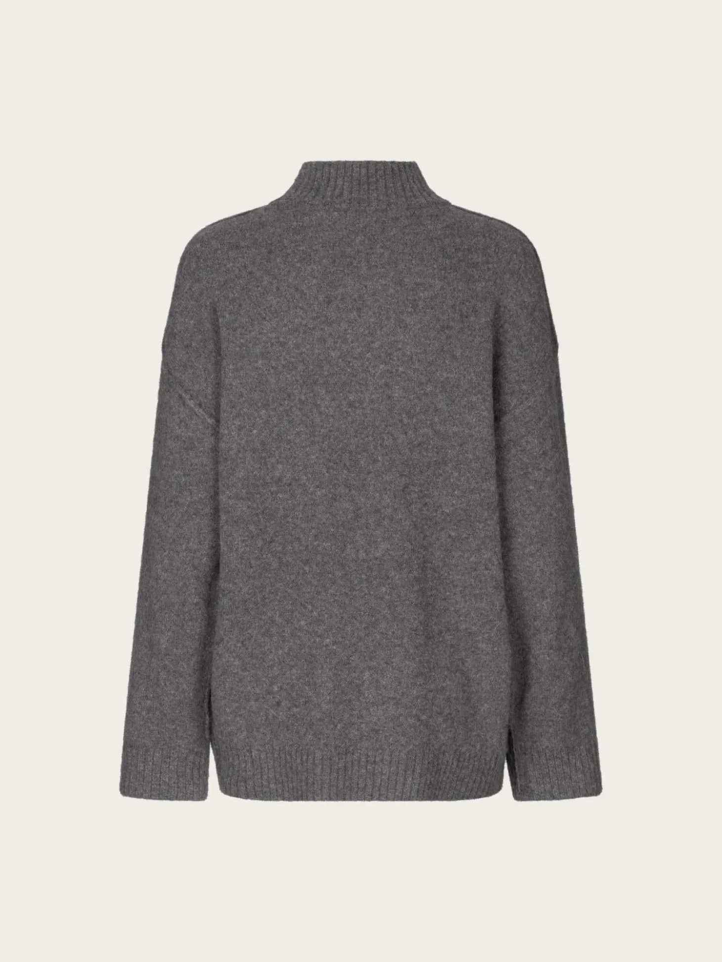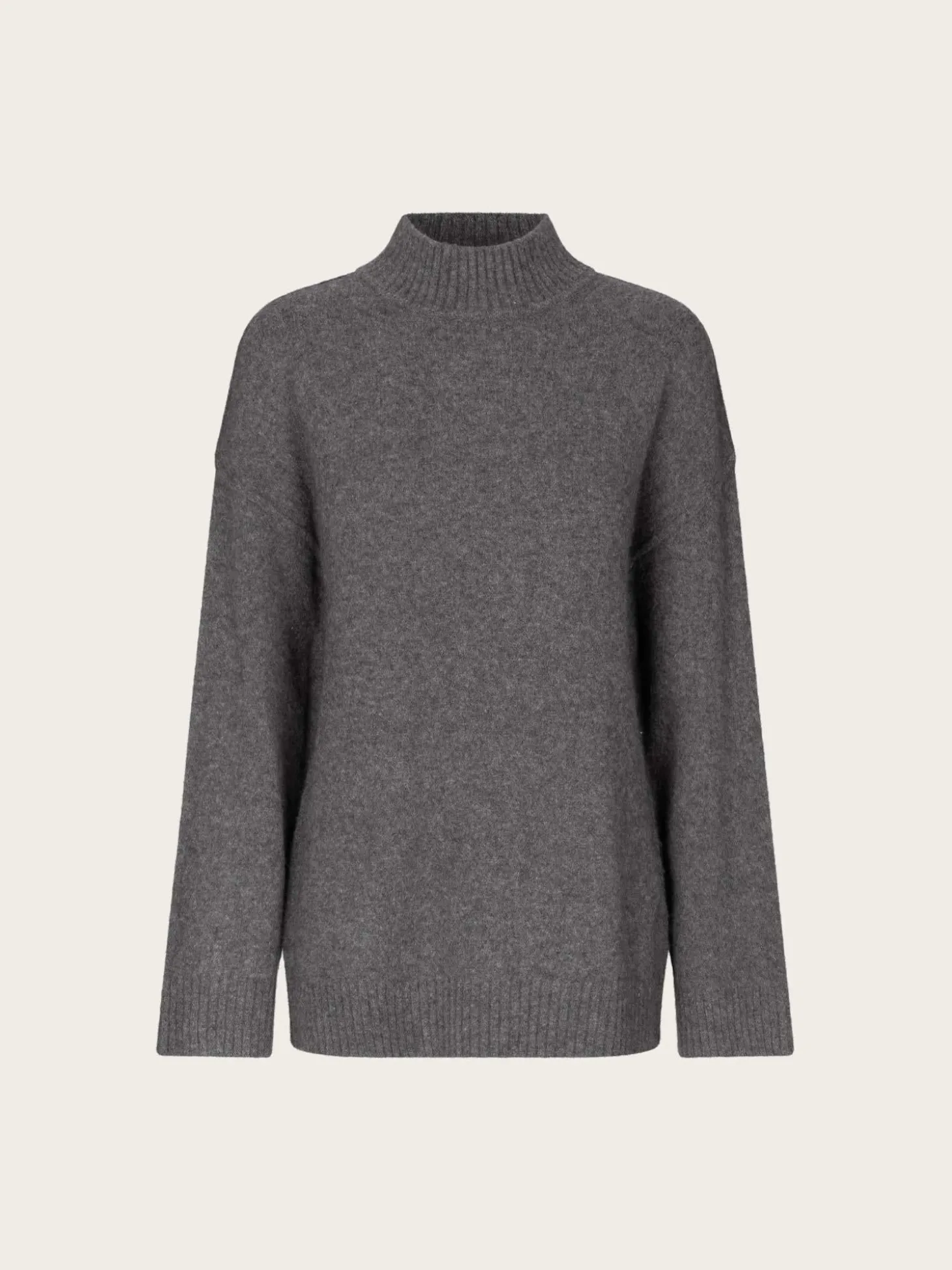 En nydelig myk strikkegenser, i en oversized passform og lengde. Den har høy hals og lange ermer.
