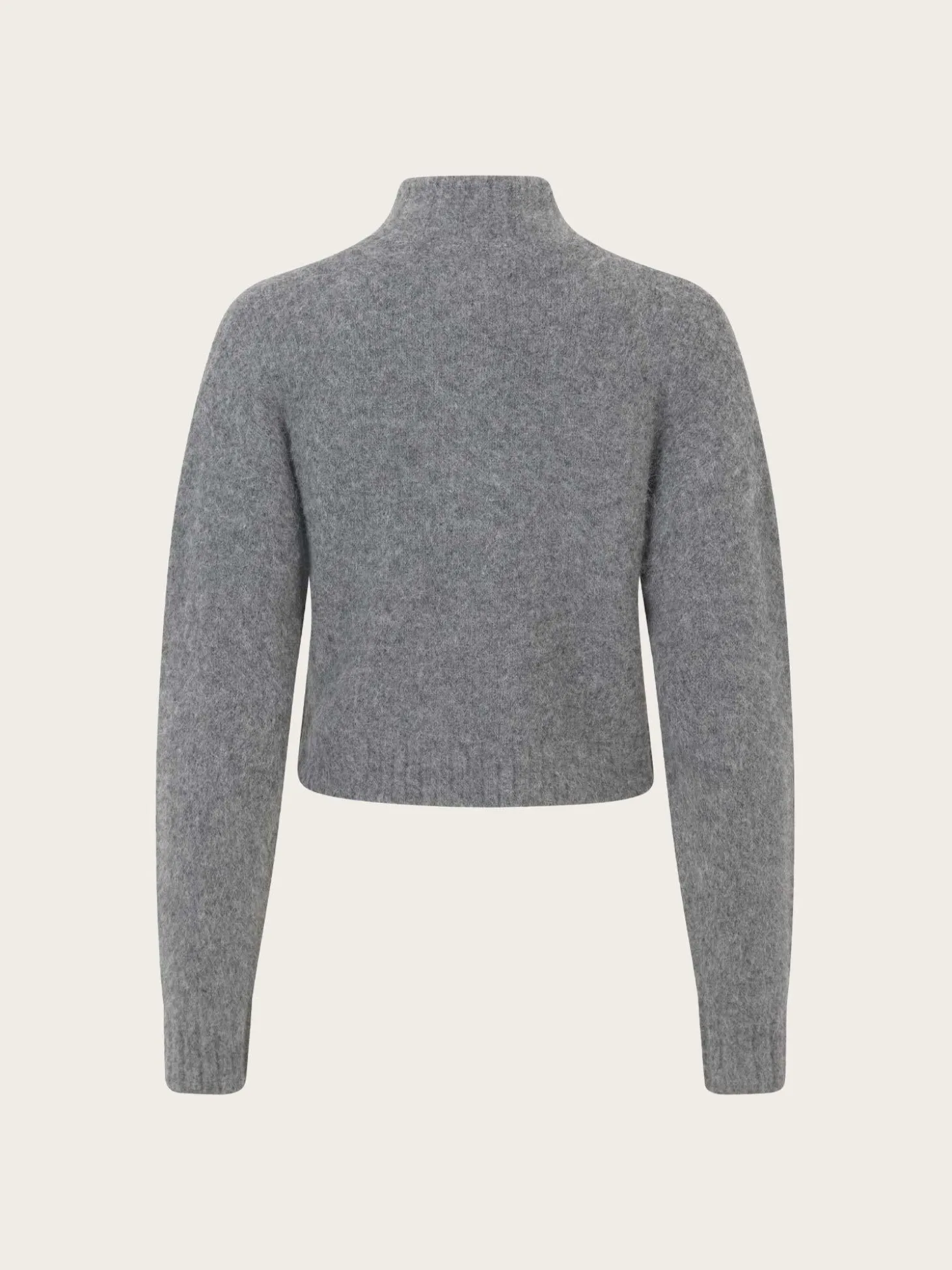 En myk og deilig strikkecardigan, med en kort og smal passform. Den har glidelås i front og en høy hals.