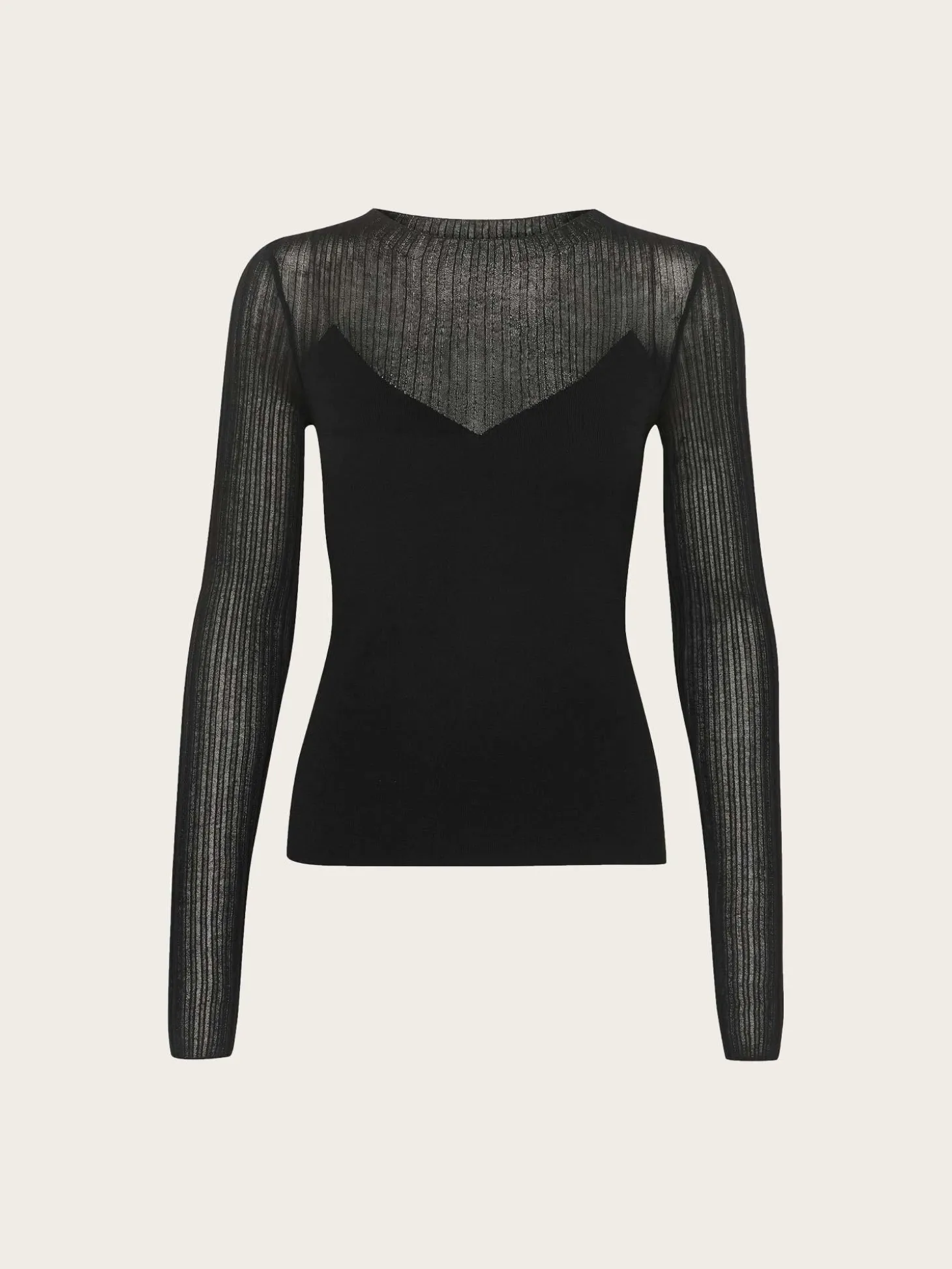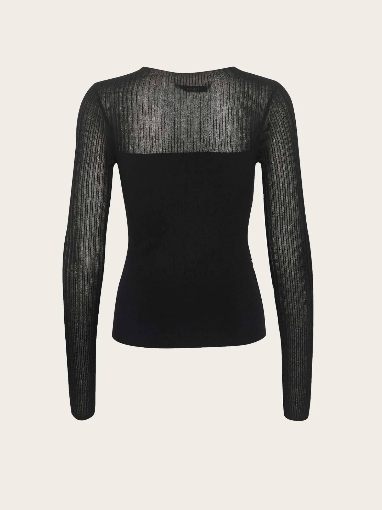Ribbestrikket bluse med lange ermer og tettsittende passform. Dem er semitransparent på ermene og over skulderene.