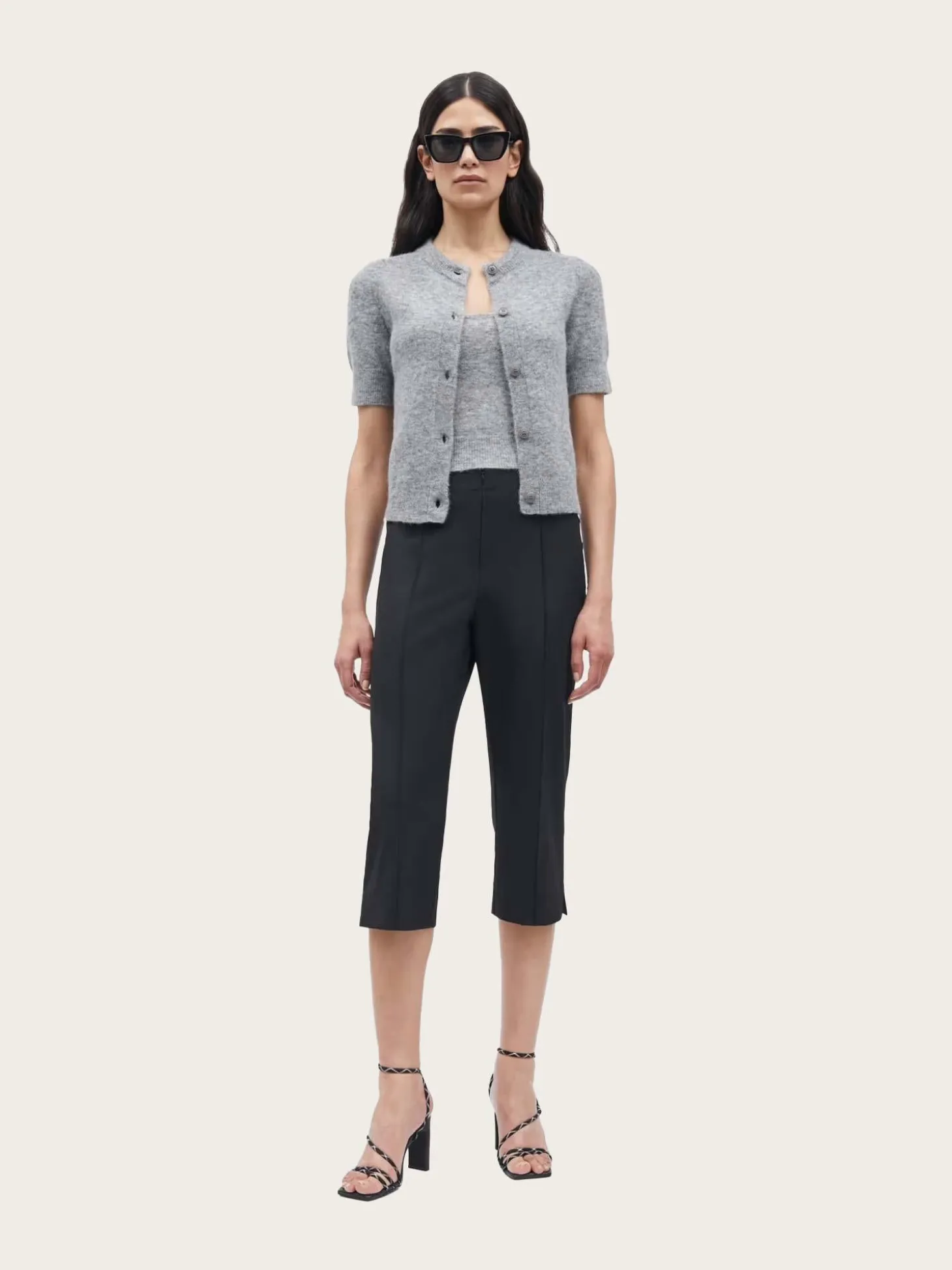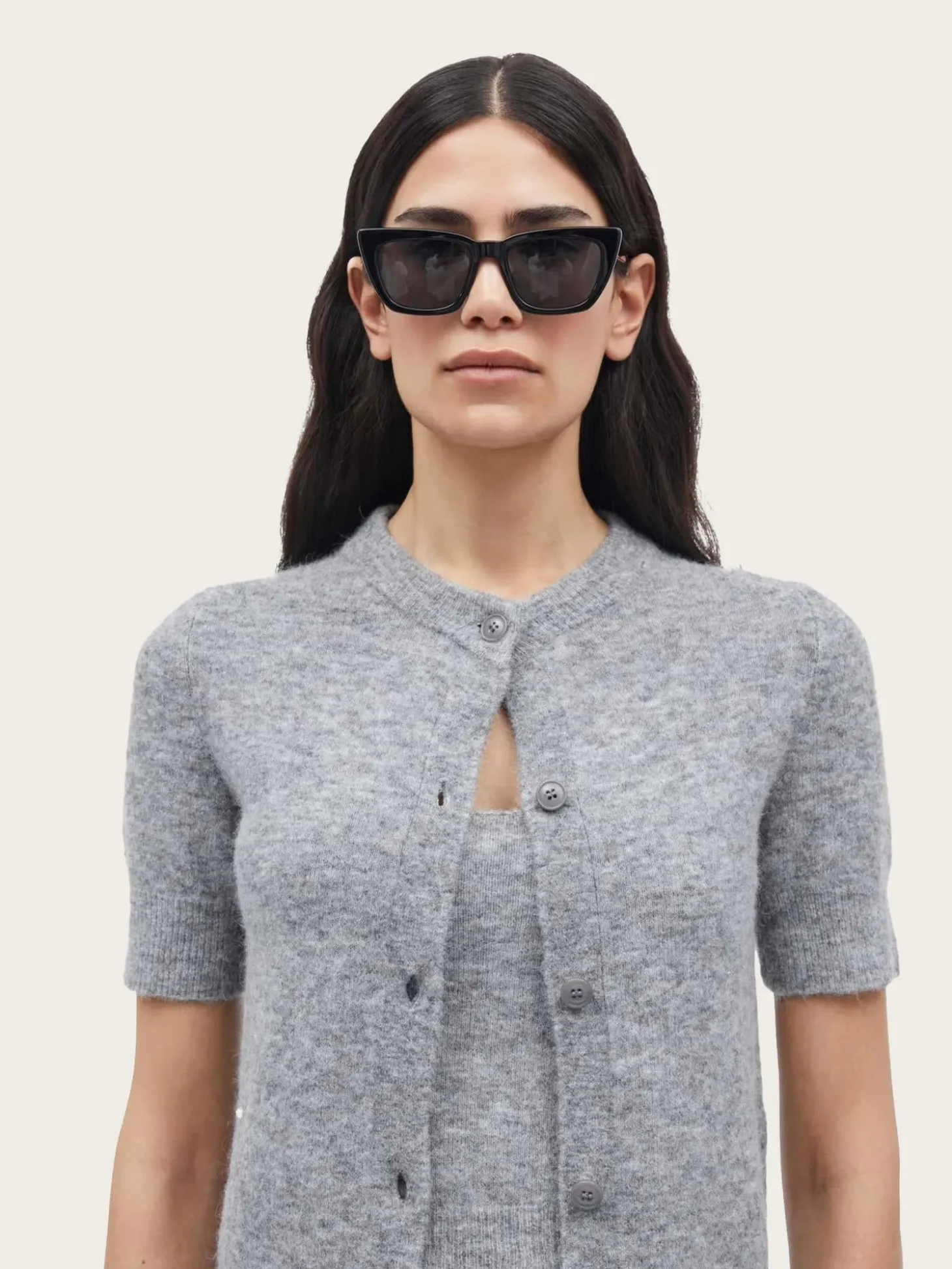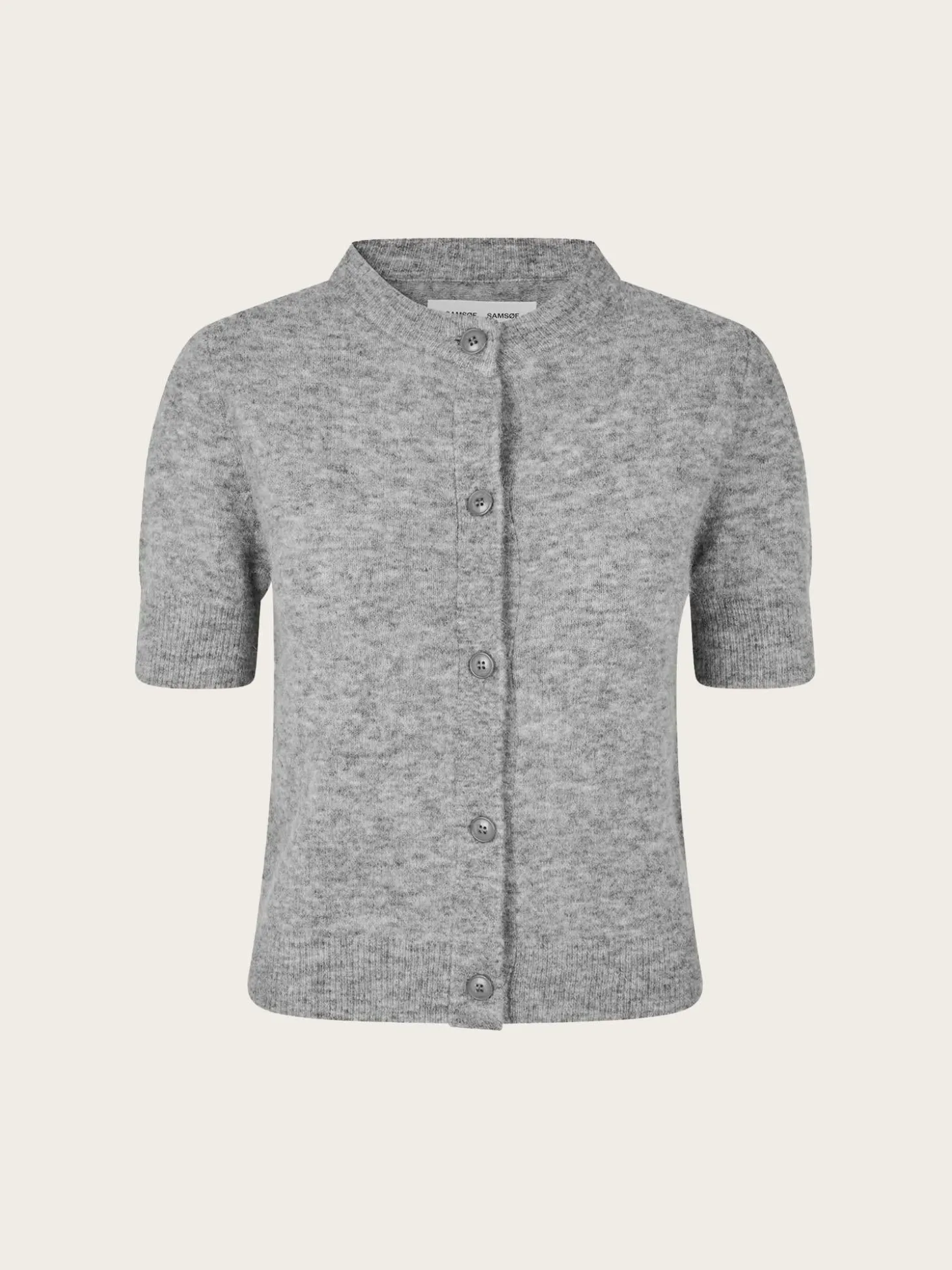En tidløs cardigan med korte ermer og klassisk passform. Designet med rund hals, knappelukking i front og ribbestrikkede kanter for et sofistikert uttrykk.
