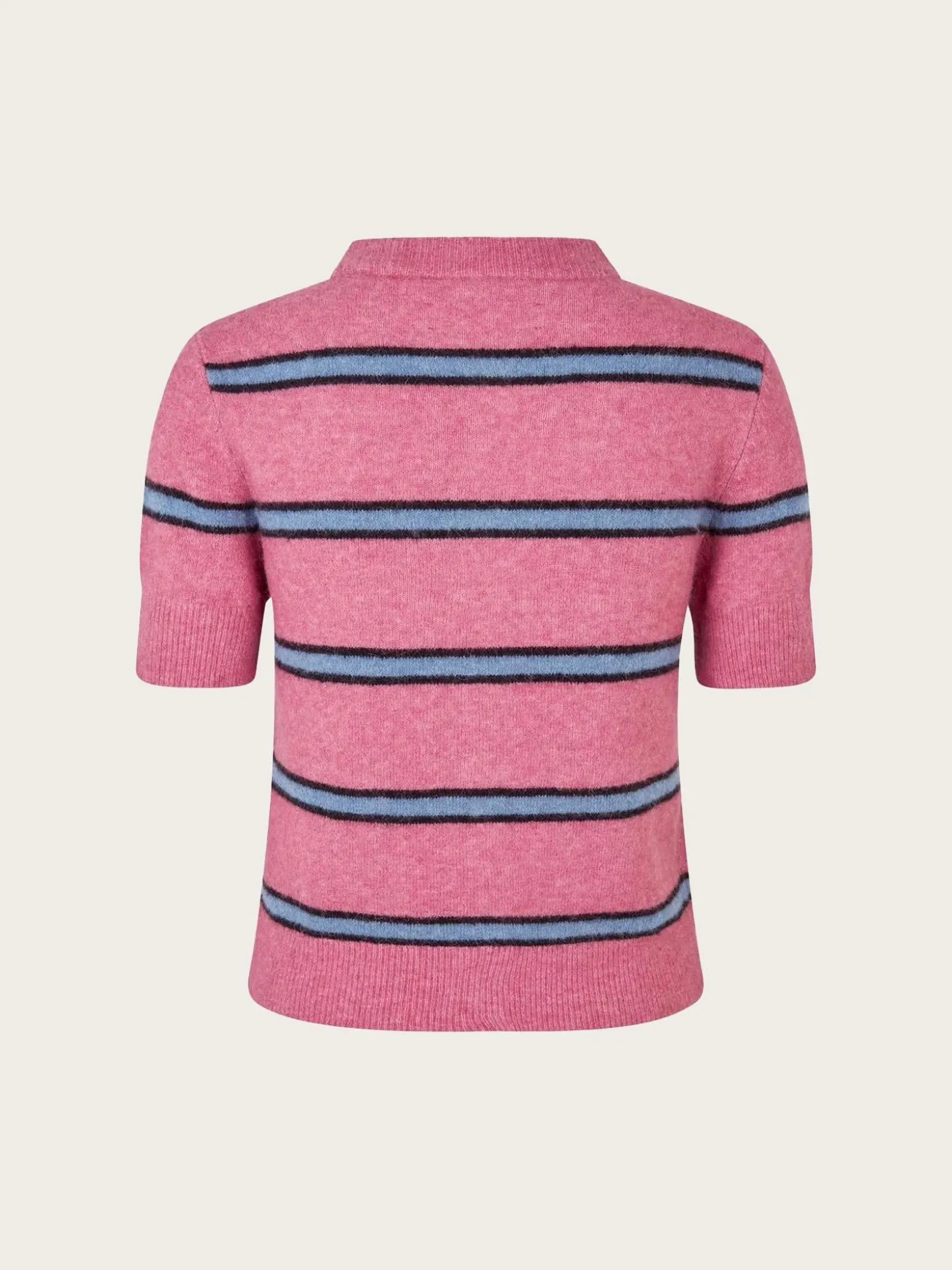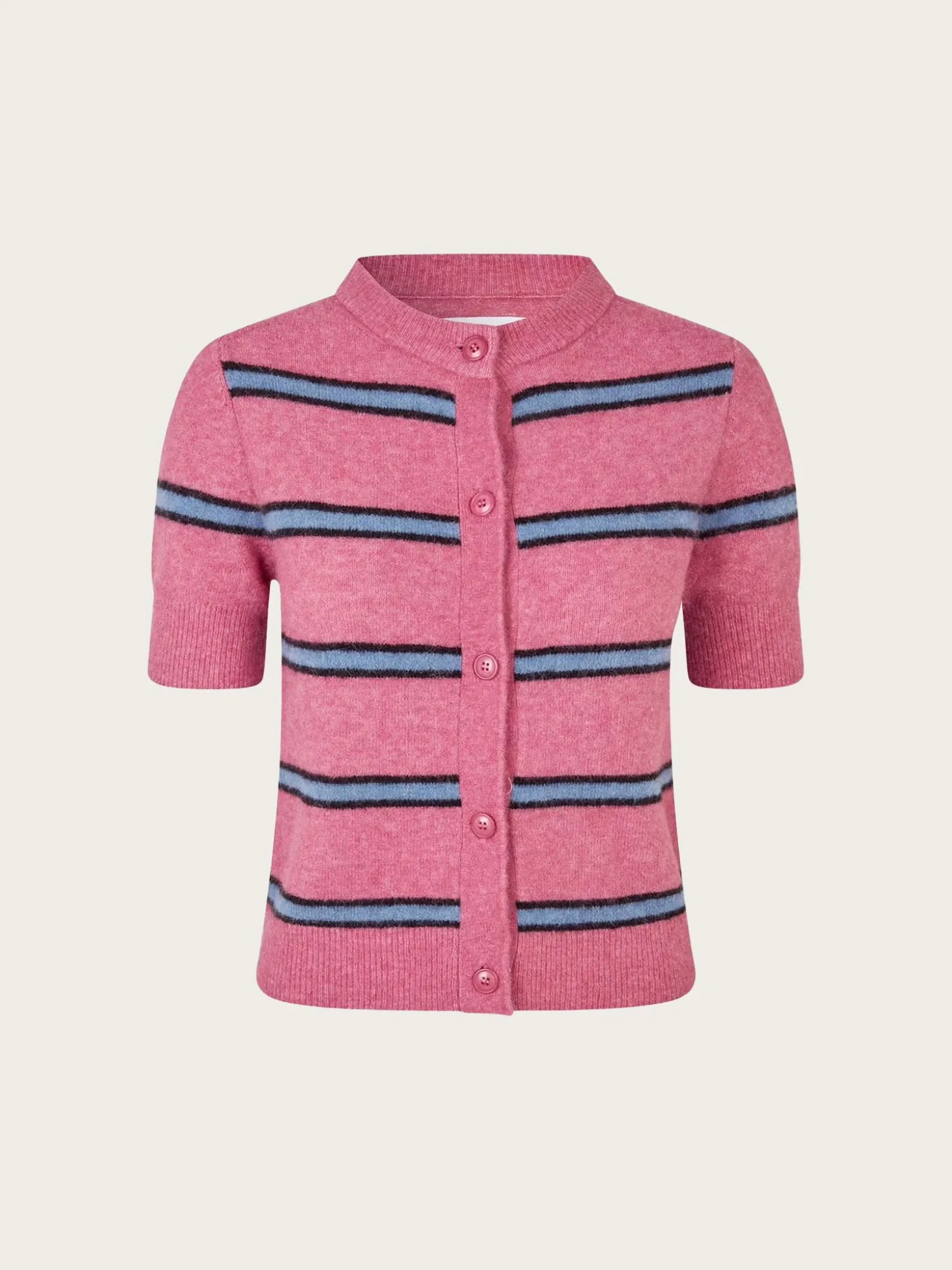 En tidløs cardigan med korte ermer og klassisk passform. Designet med rund hals, knappelukking i front og ribbestrikkede kanter for et sofistikert uttrykk.