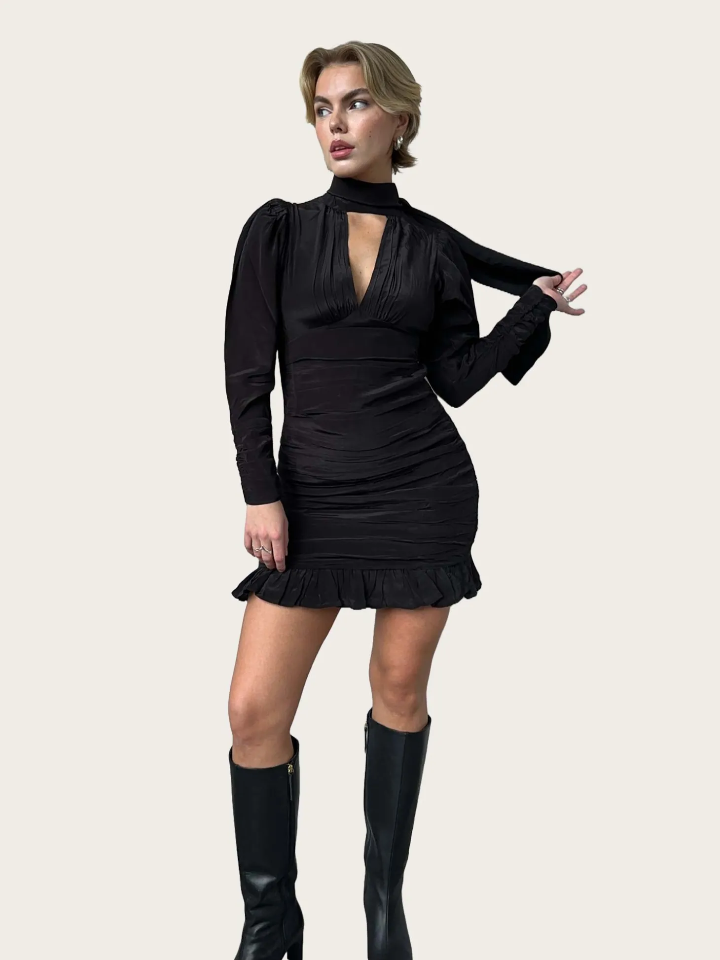 En nydelig kjole i glatt sateng. Den har lange puffermer, v-hals og smal passform. Kjolen har dekorativt bånd i halsen og flatternede draperinger.