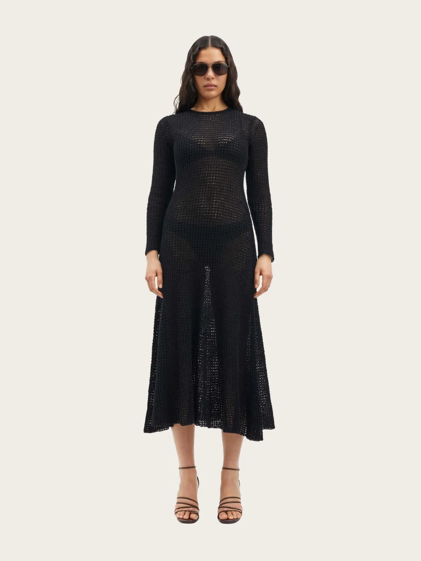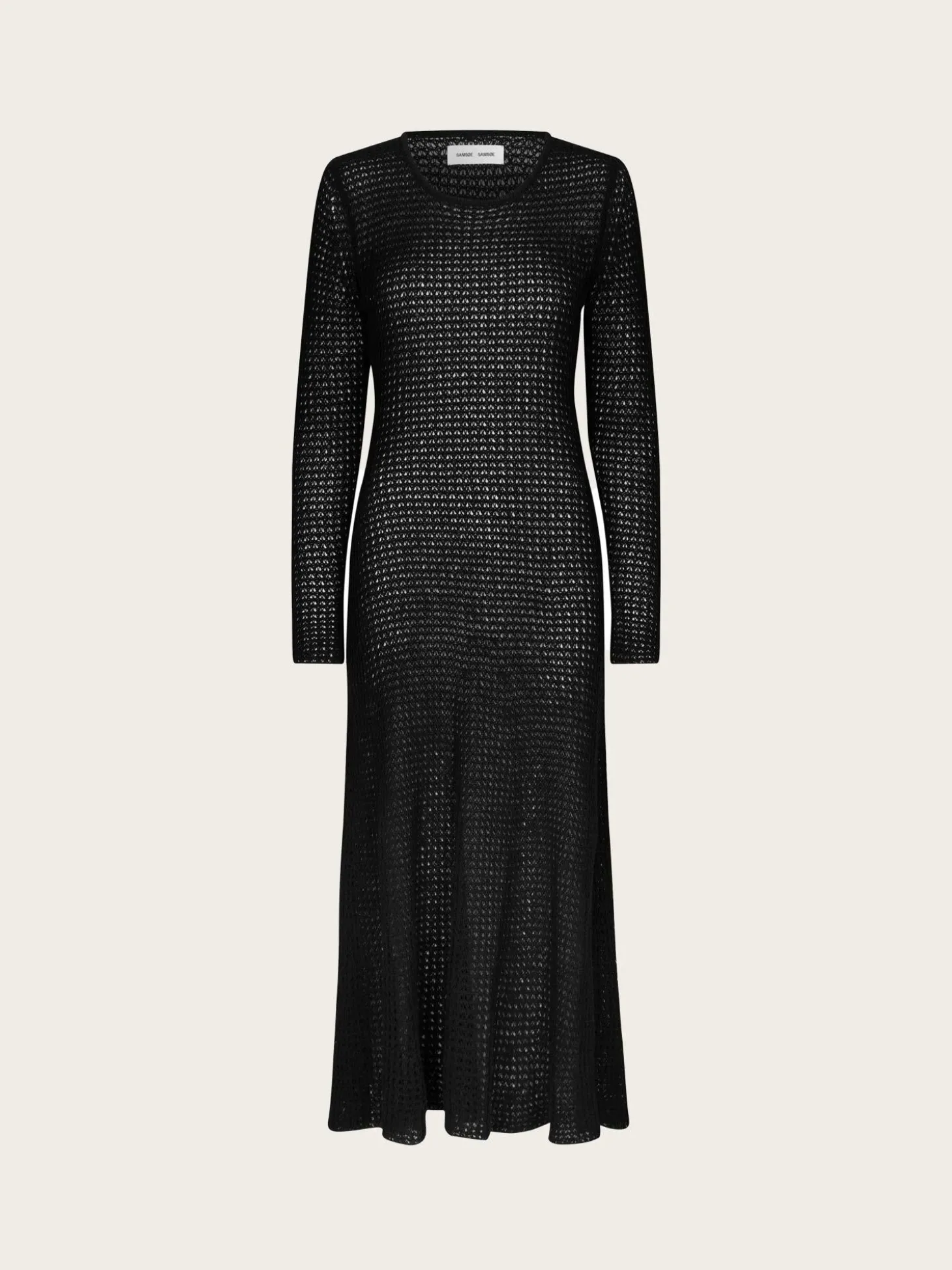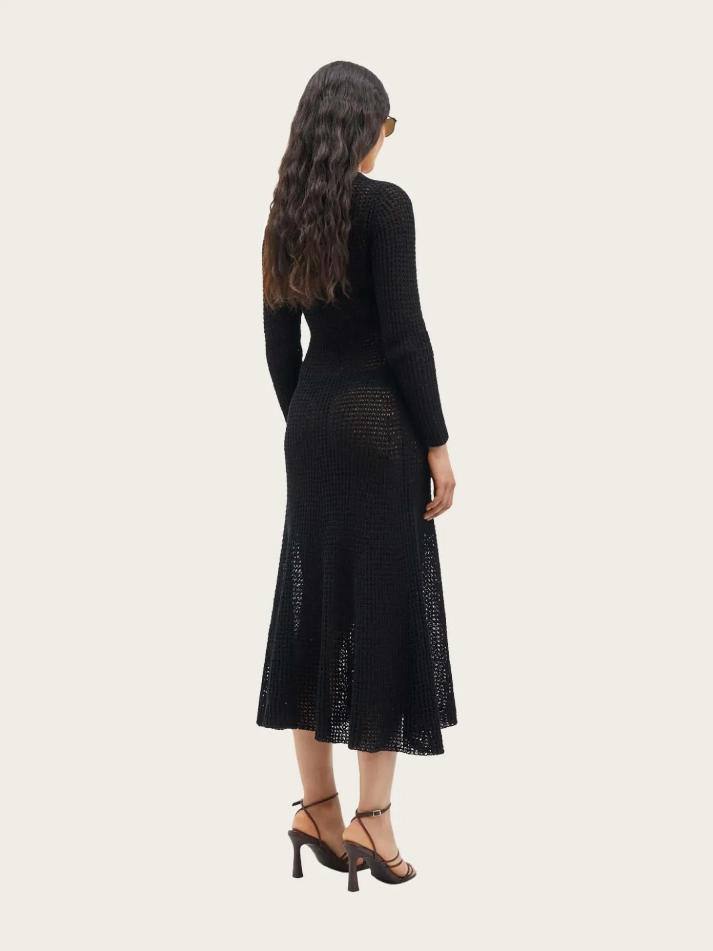 En svart, langermet heklet midikjole med normal passform og utsvingt skjørt. Kjolen er laget av en blanding av resirkulert bomull og bomull.