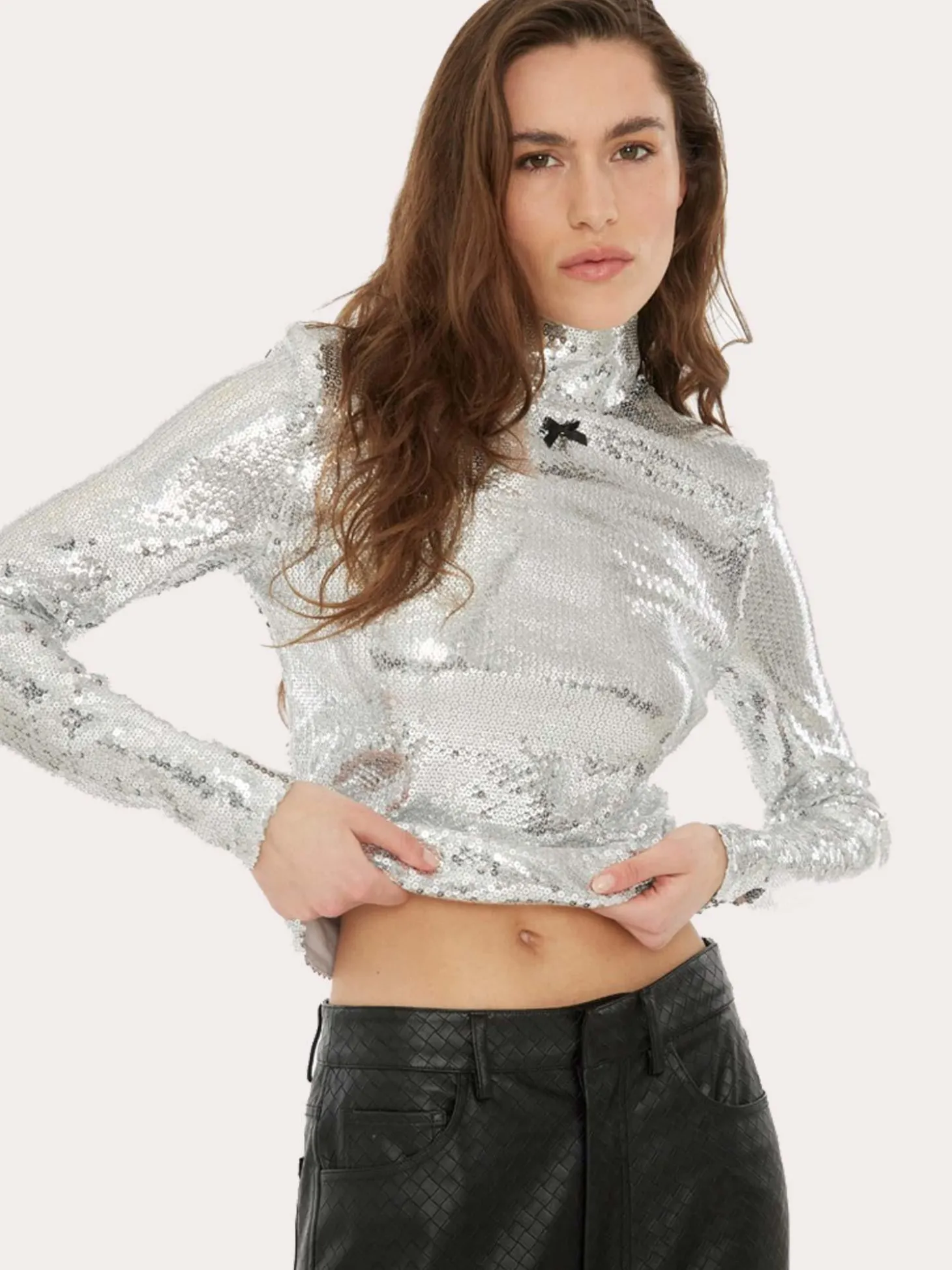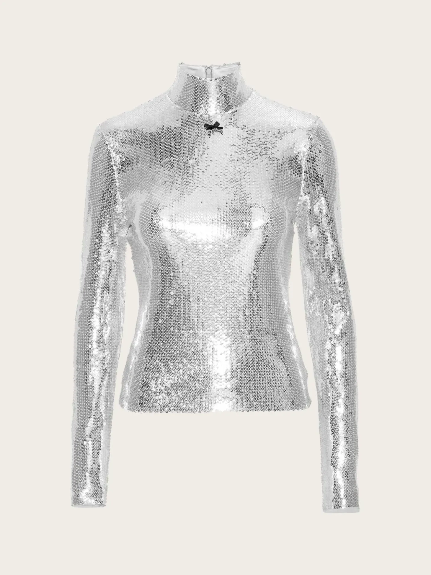 En kul høyhalset topp med sølvpaljetter og en søt sort sløyfe i front. Den har lange ermer og en smal passform.