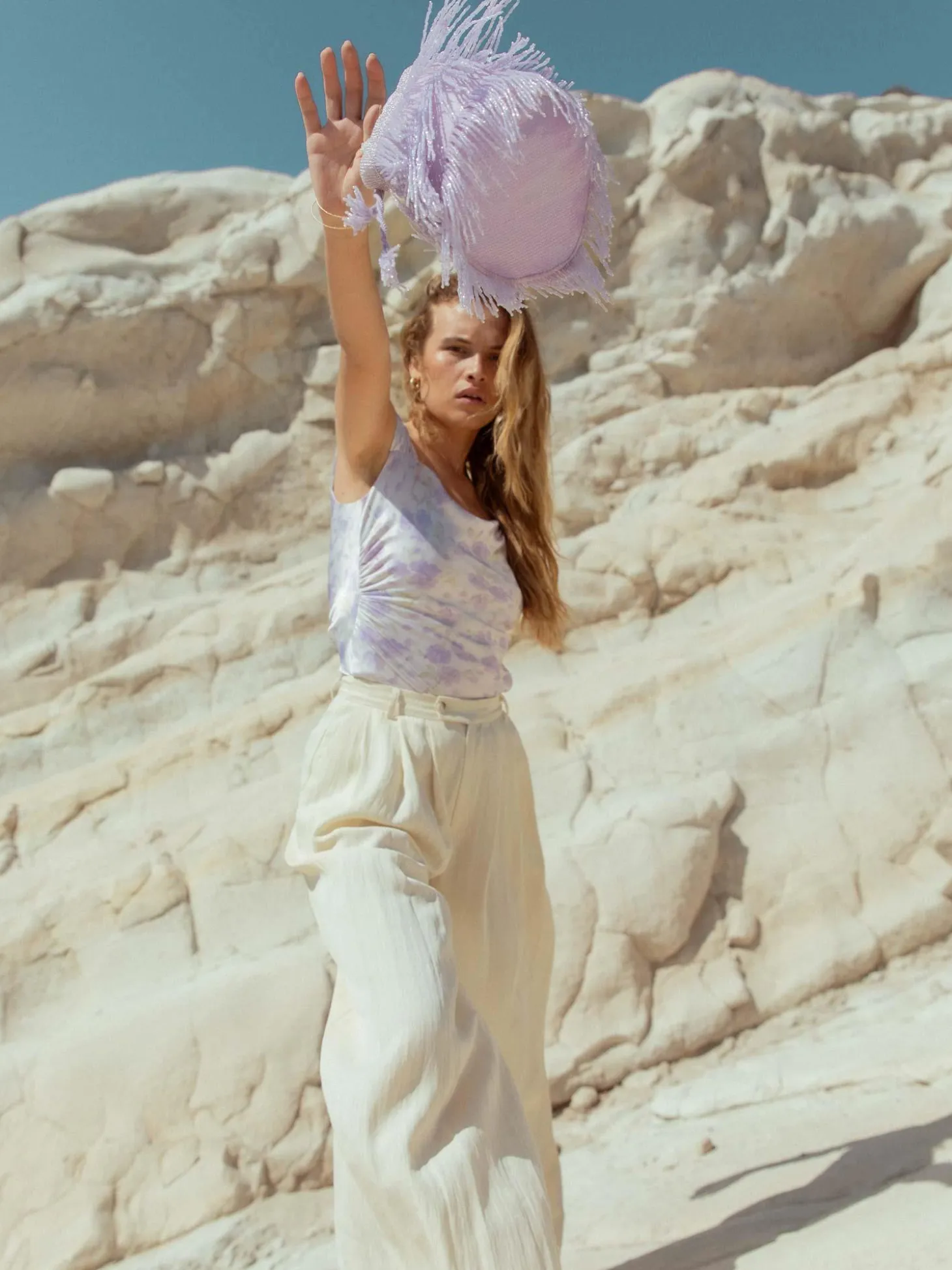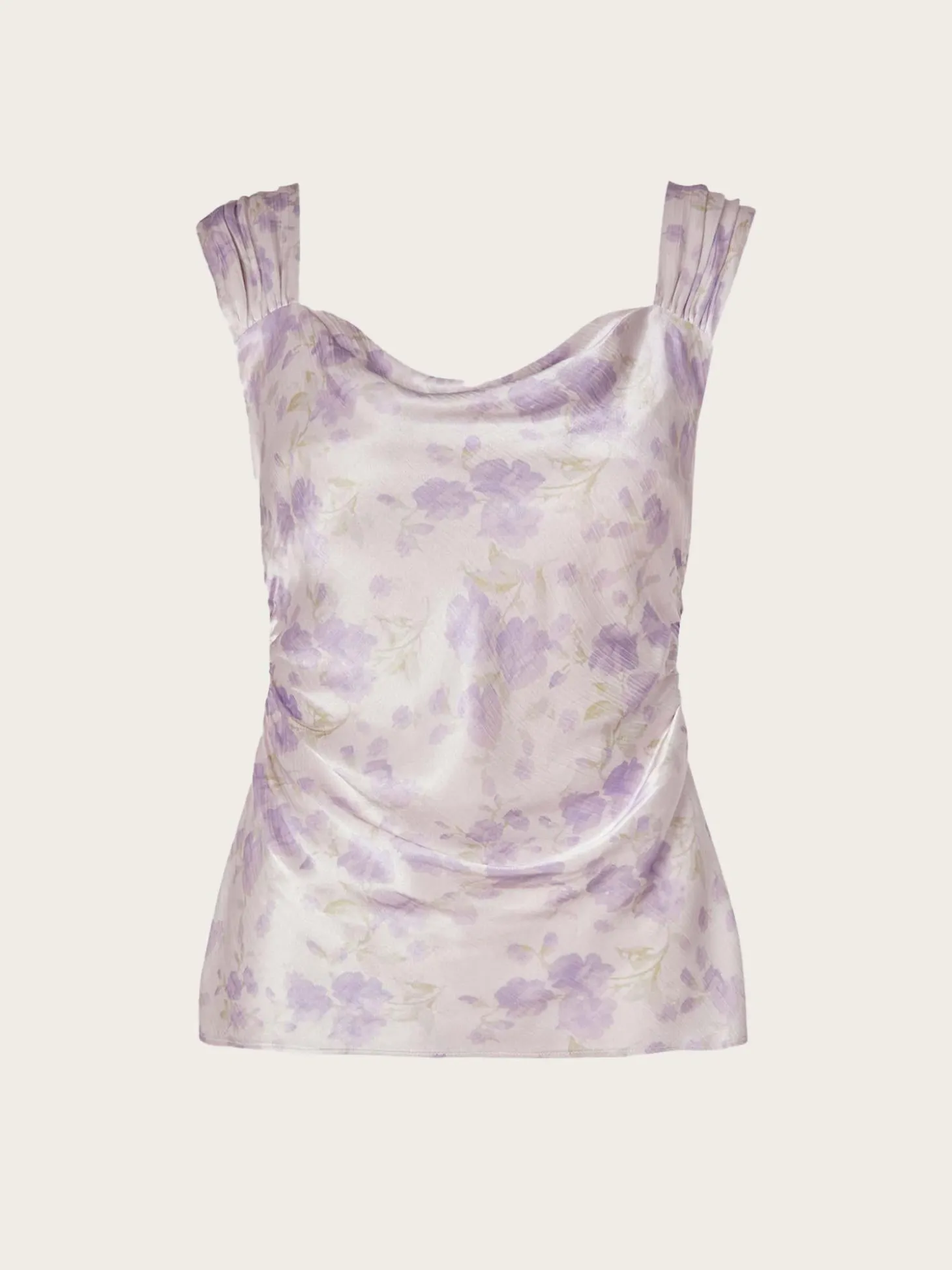 En lavendelfarget topp designet med brede skulderstropper, drapert utringing og med en feminin passform.