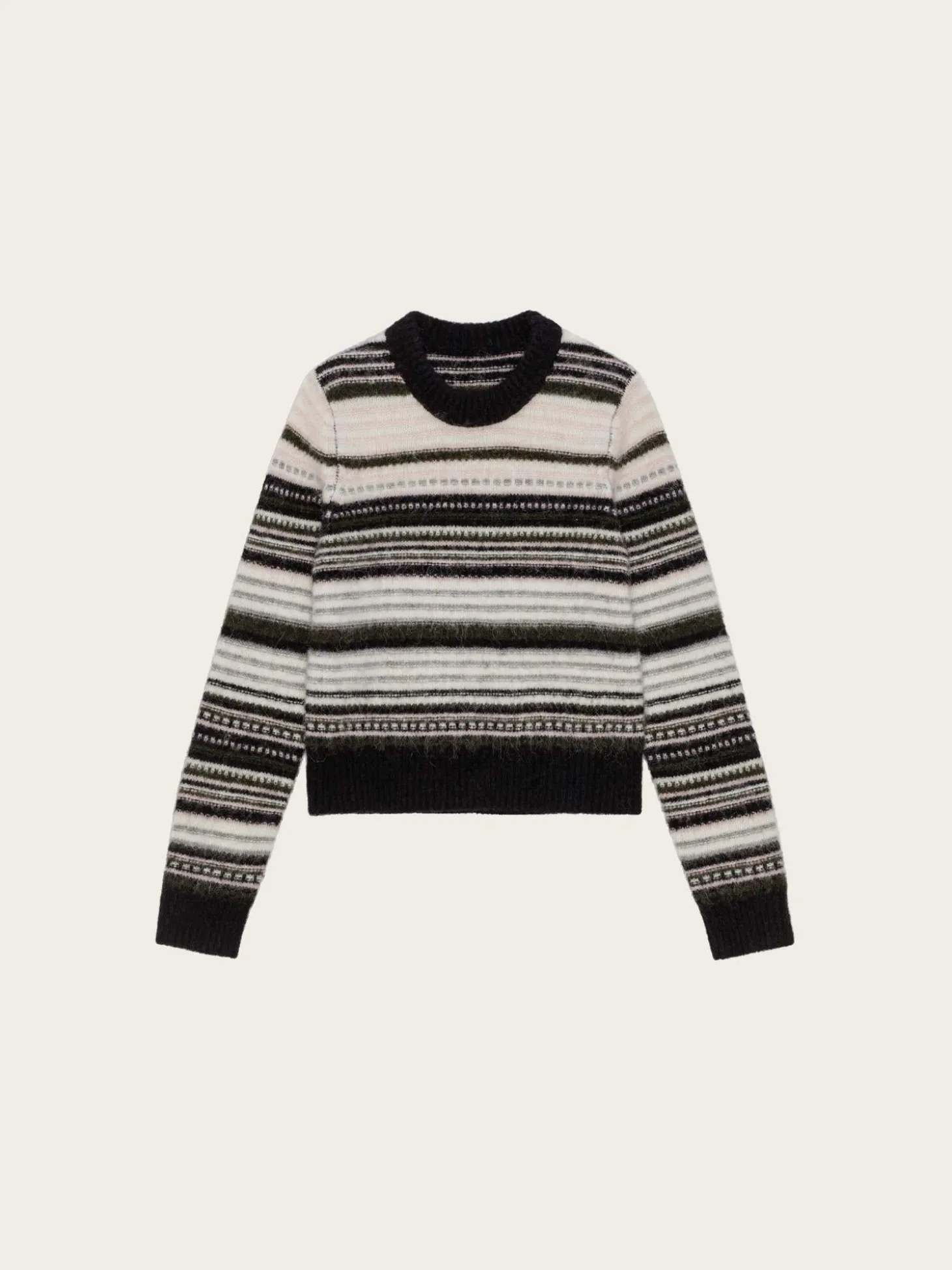 En nydelig strikkegenser med et stripemønster i sort, hvitt og grå. Den har en normal passform.