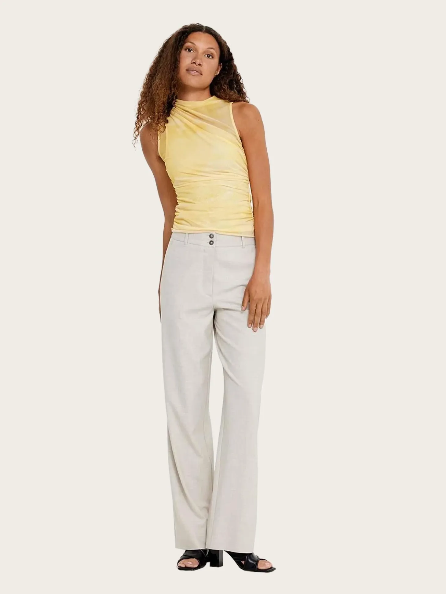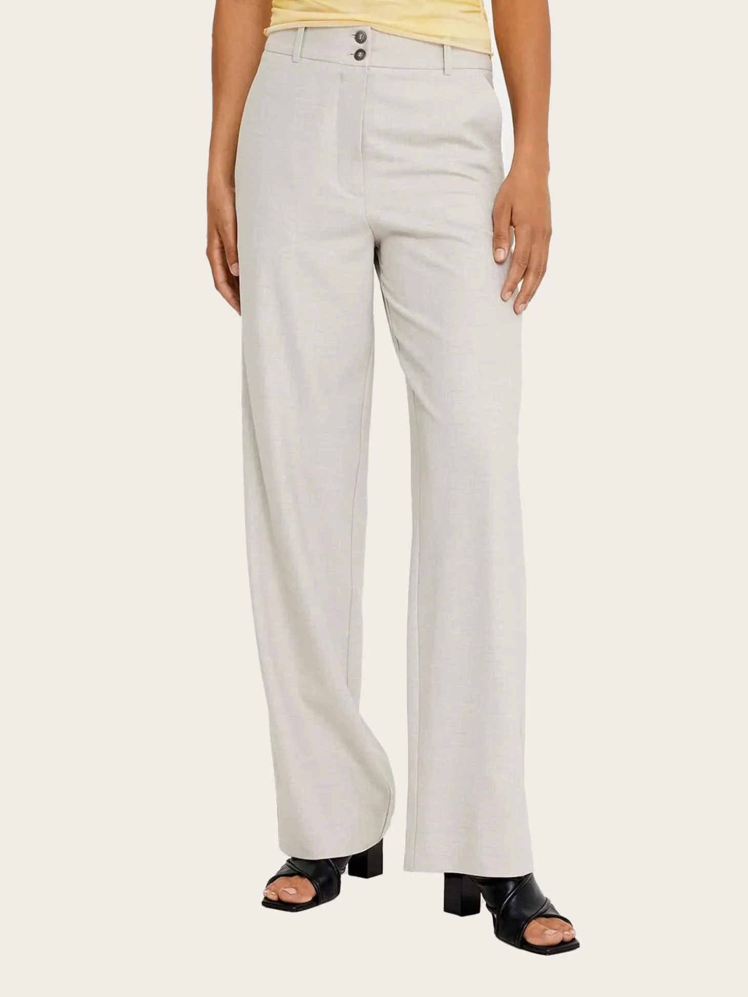 En klassisk og fin dressbukse med høyt liv og vide rette ben. Buksen har lommer på sidene og lukkes med glidelås og to knapper.