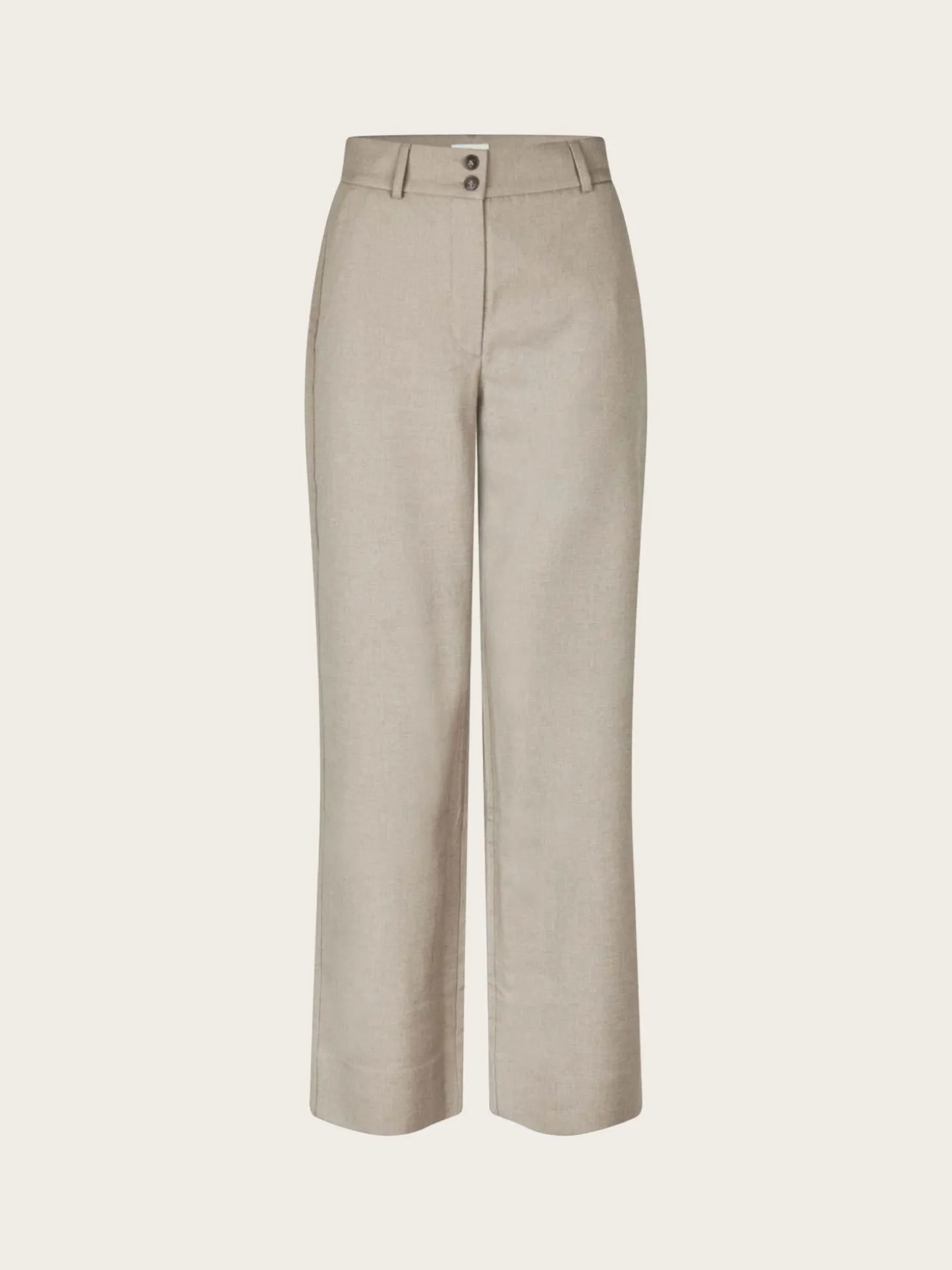 En klassisk og fin dressbukse med høyt liv og vide rette ben. Buksen har lommer på sidene og lukkes med glidelås og to knapper.