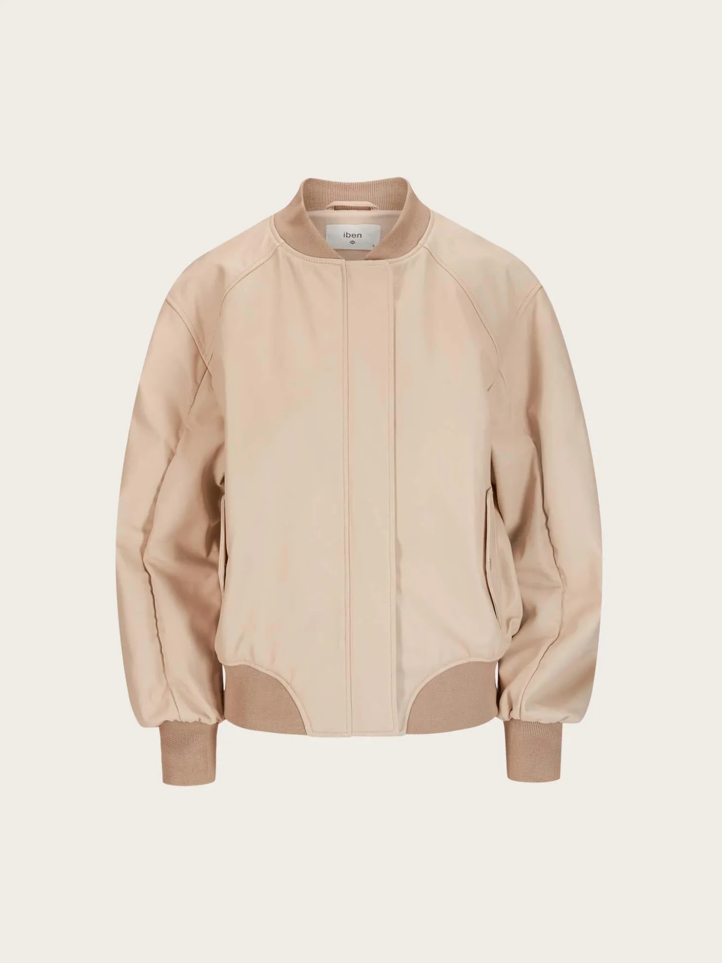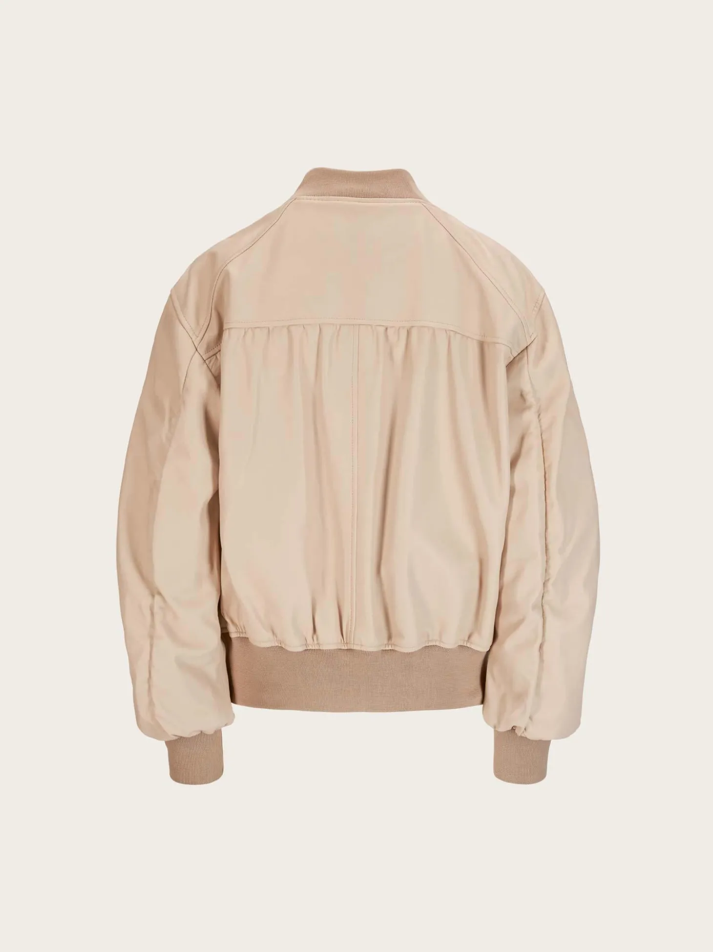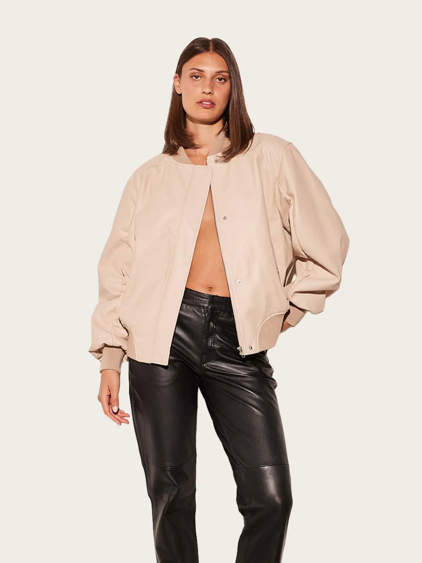 En elegant og avslappet bomberjakke i skinn med volangdetaljer på armene. Jakken har elastiske ribbestrikket hals og mansjetter og praktiske sidelommer.