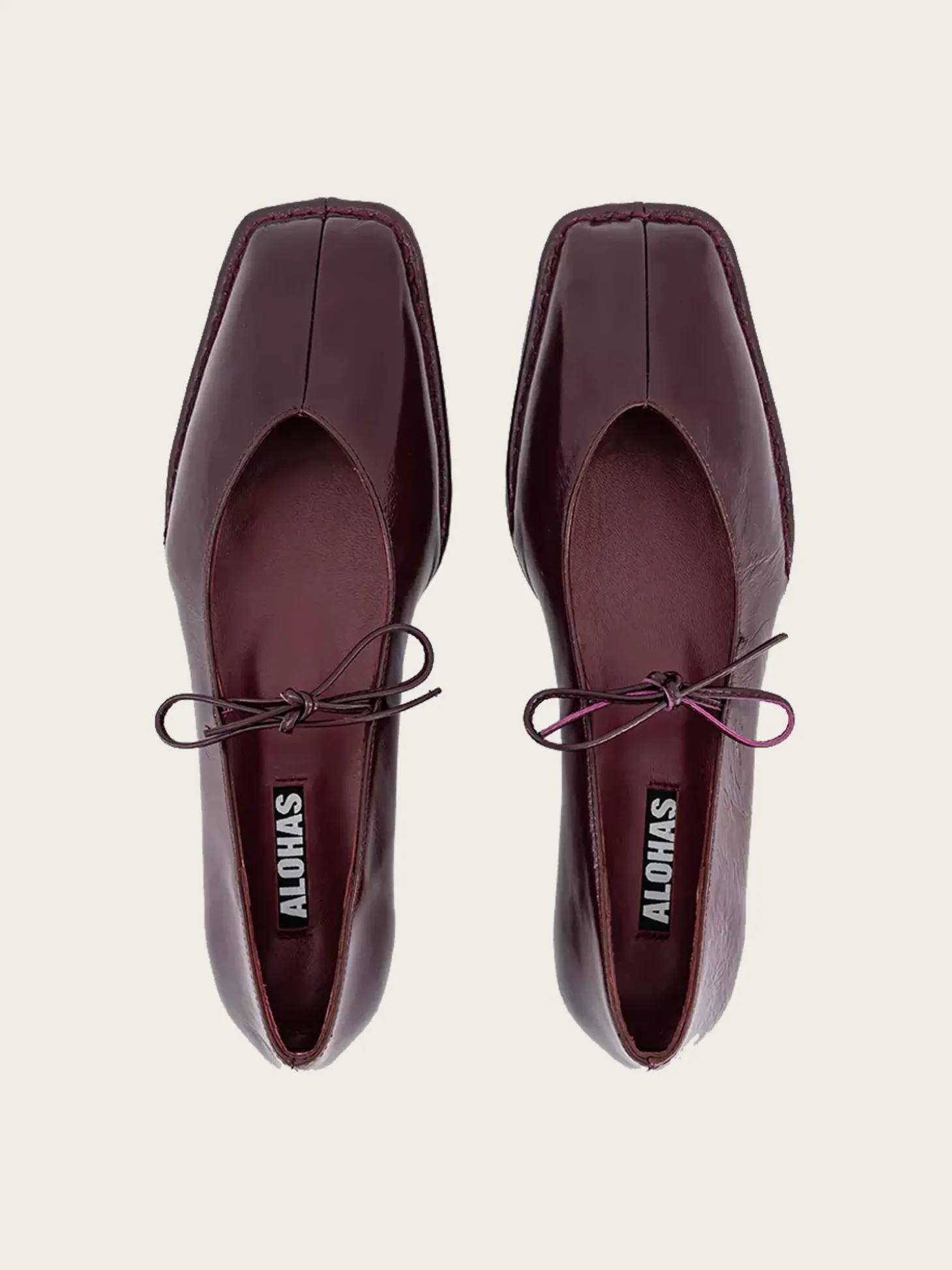 Klassiske og enkle ballerinasko med snøring over rist. Den har en firkantet tå og liten hæl.