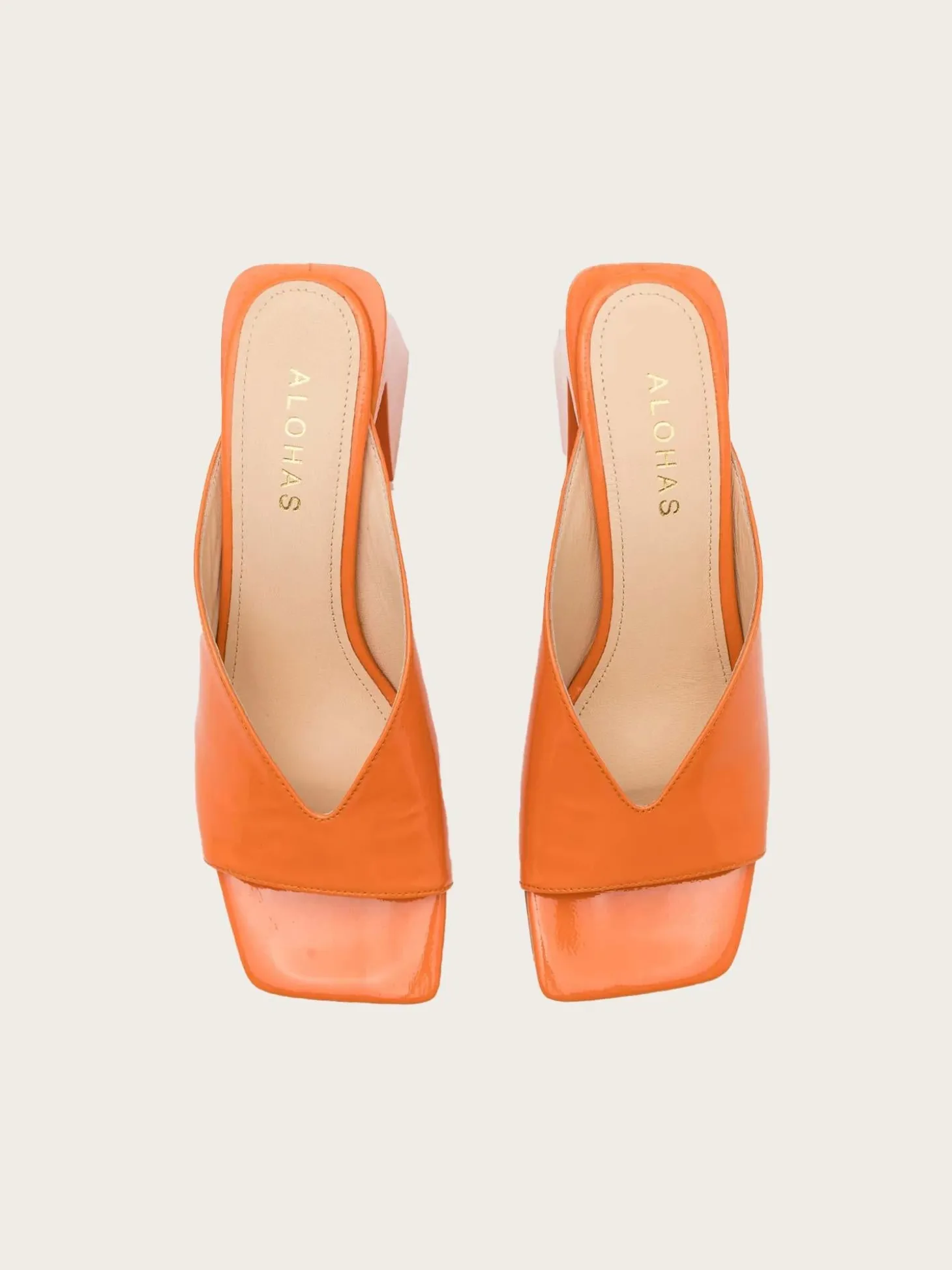 En fresh, oransje sandal med blokkhæl som har en 8 cm høyde. Sandalene har åpen tå og er slip in.