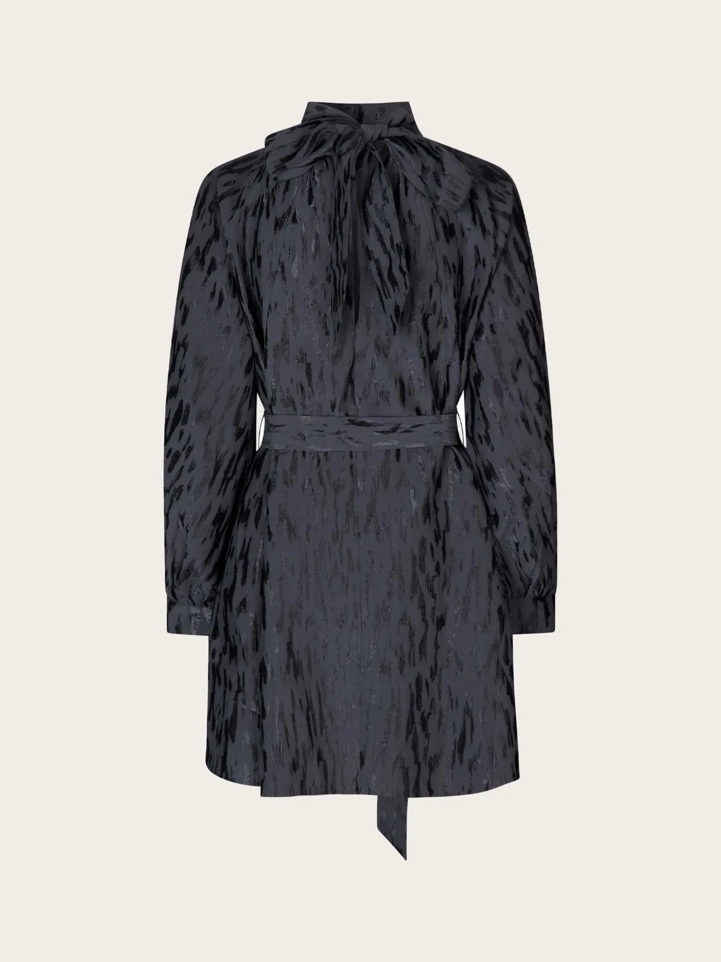En fin kjole med høy hals, lange ermer og løs passform. Den har bånd i nakken som kan knytes som sløyfe, og avtagbart belte i midjen.