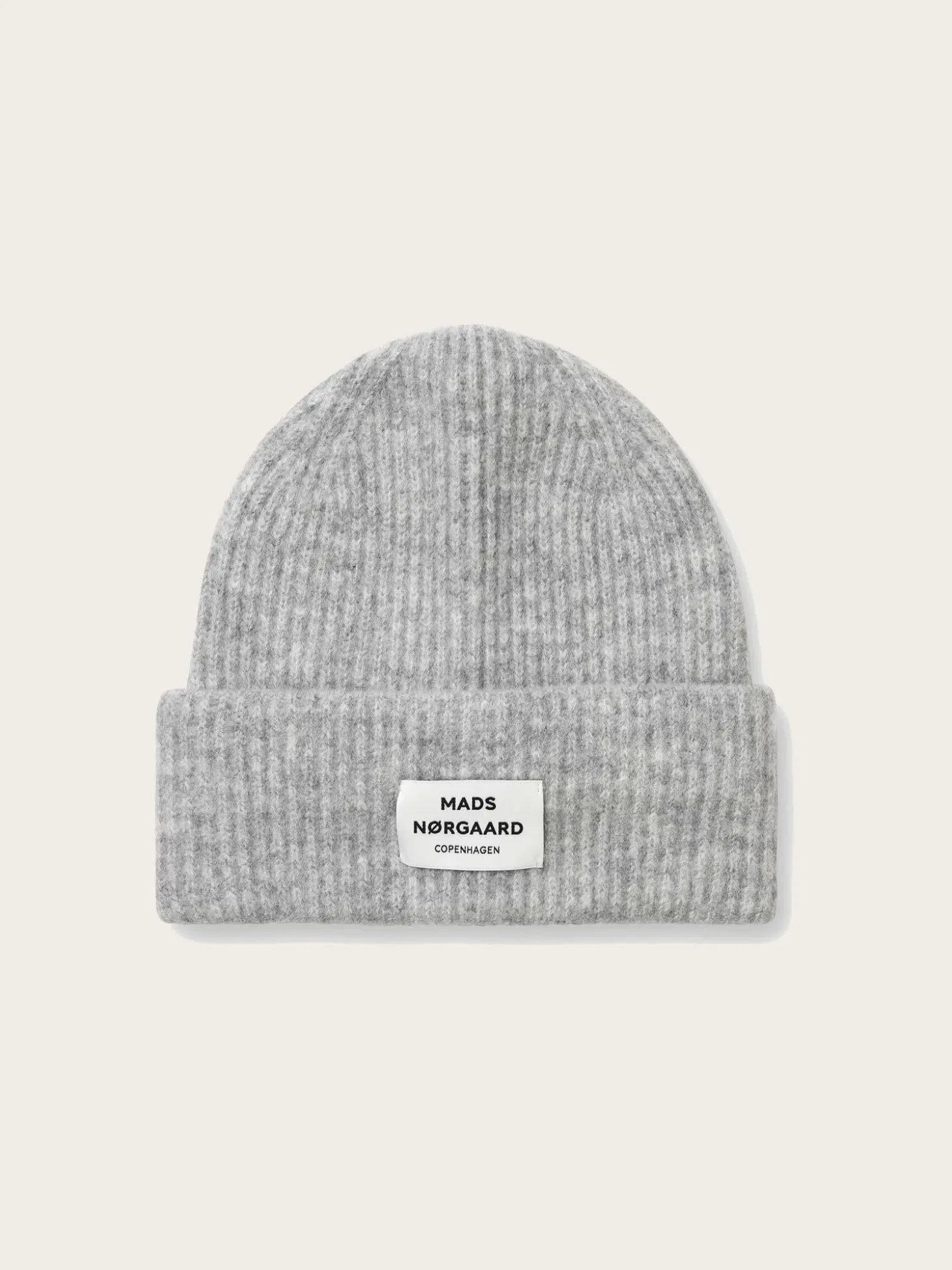 Ribbestrikket lue i en myk ullblanding. Den har bred opprett og logo på oppbretten.