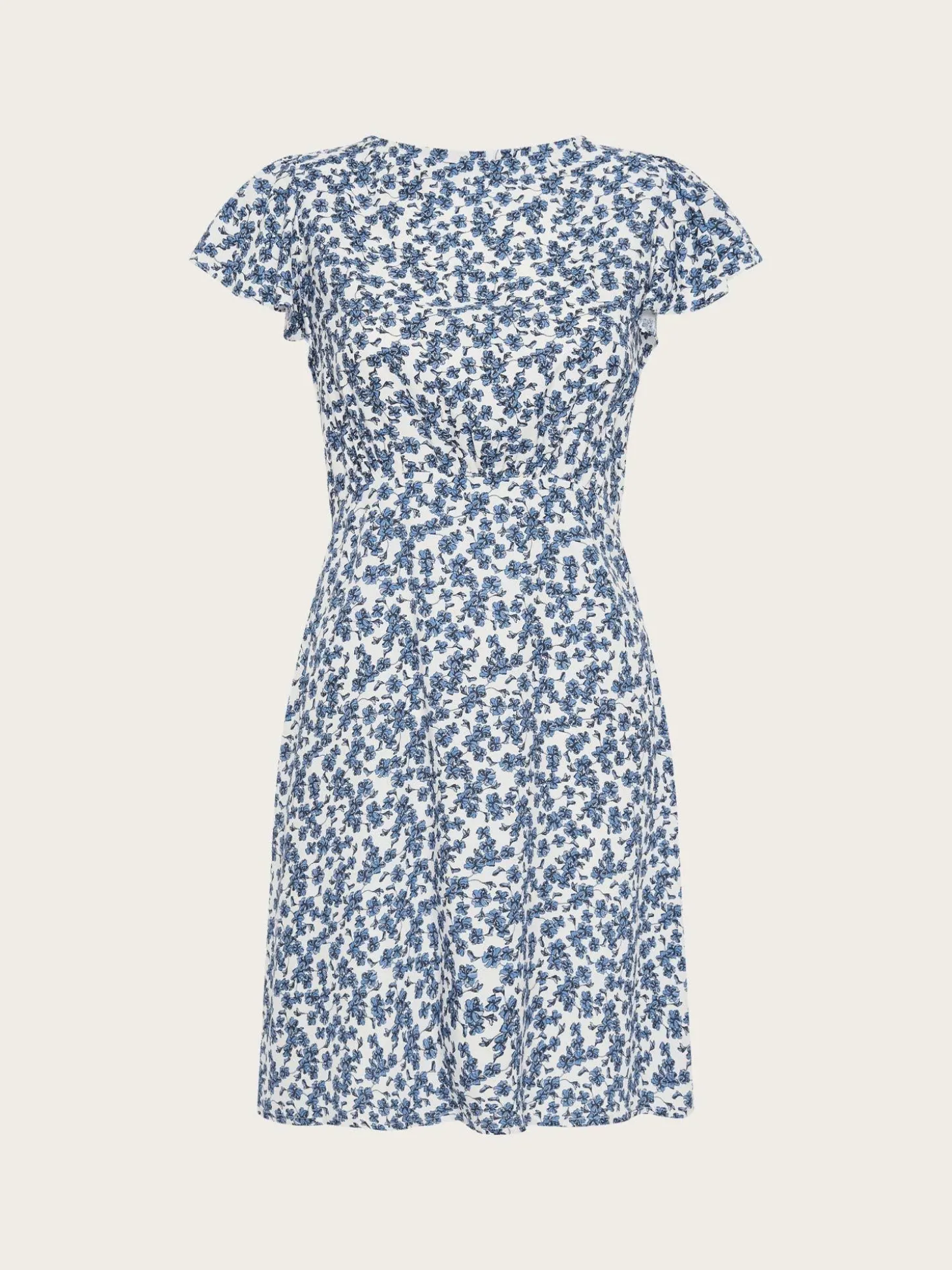 En fin minikjole i blått print. Den har rund hals, korte ermer og en dyp utringing i ryggen. Kjolen har en smal passform.