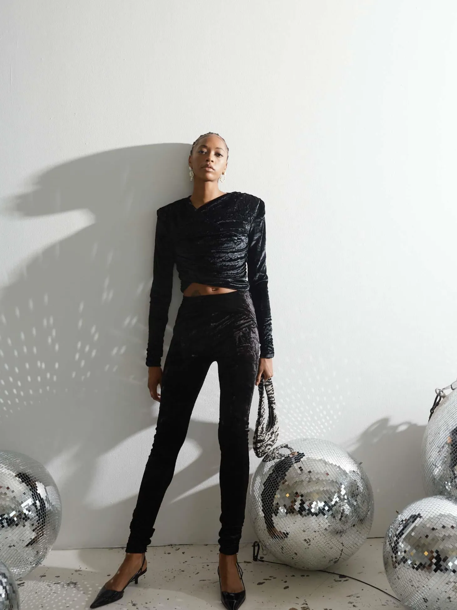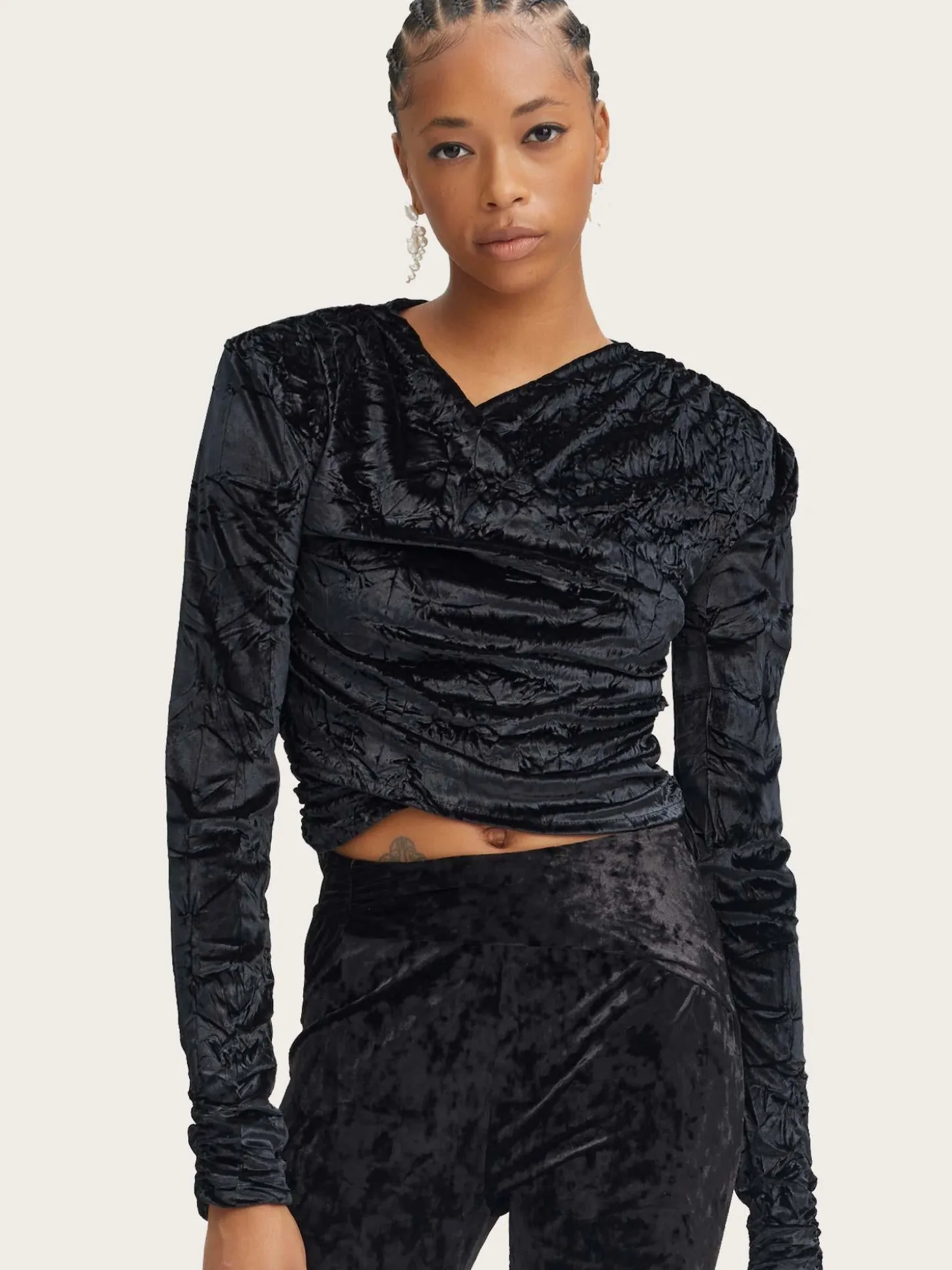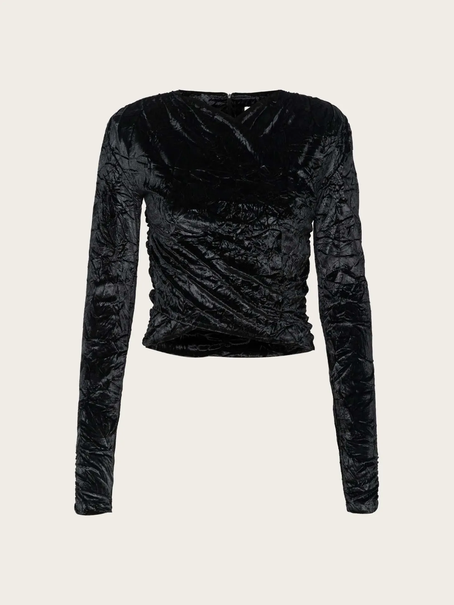 En kul topp i velur. Den har overlapp i front, lange ermer og en cropped lengde.