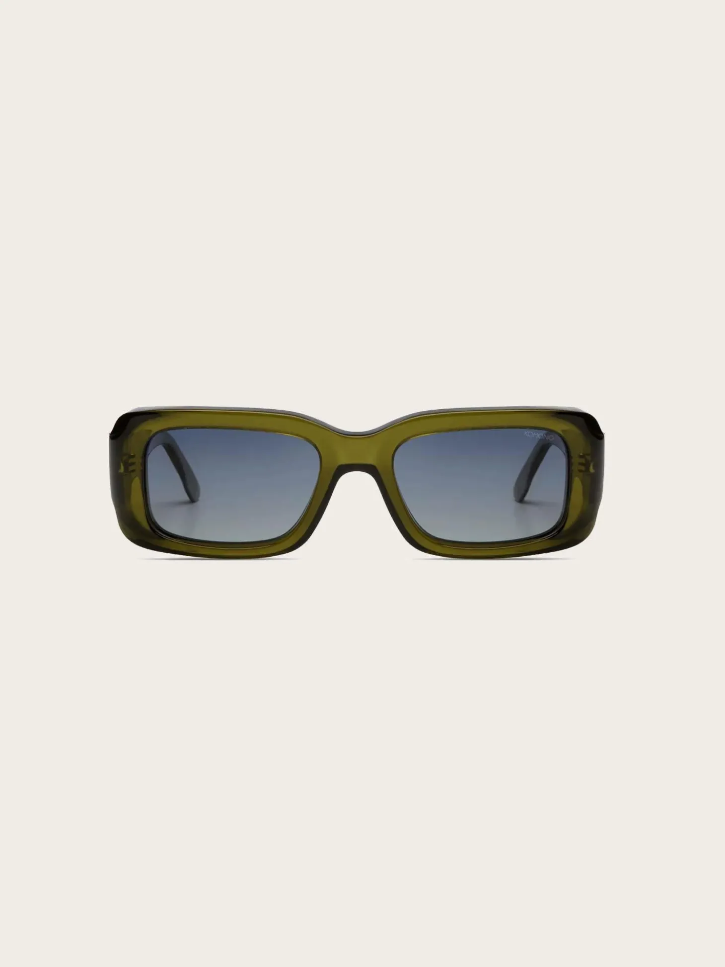 En sterk og elegant rektangulær solbrille i en fin grønnfarge. Brillene har størrelsen 14,5 x 5,2 cm på rammen, med 100% UV400 beskyttede, polariserte glass. Pusseklut og etui medfølger.