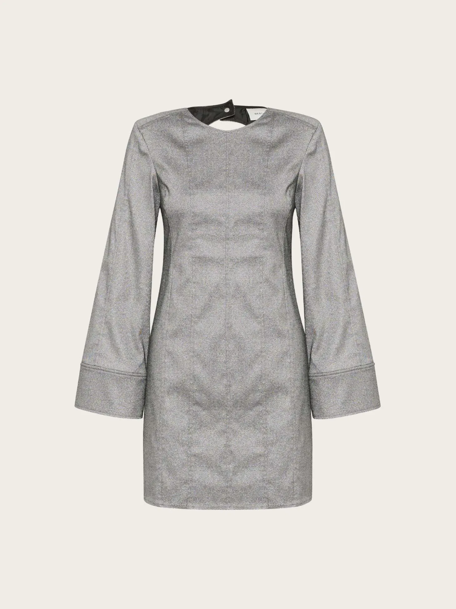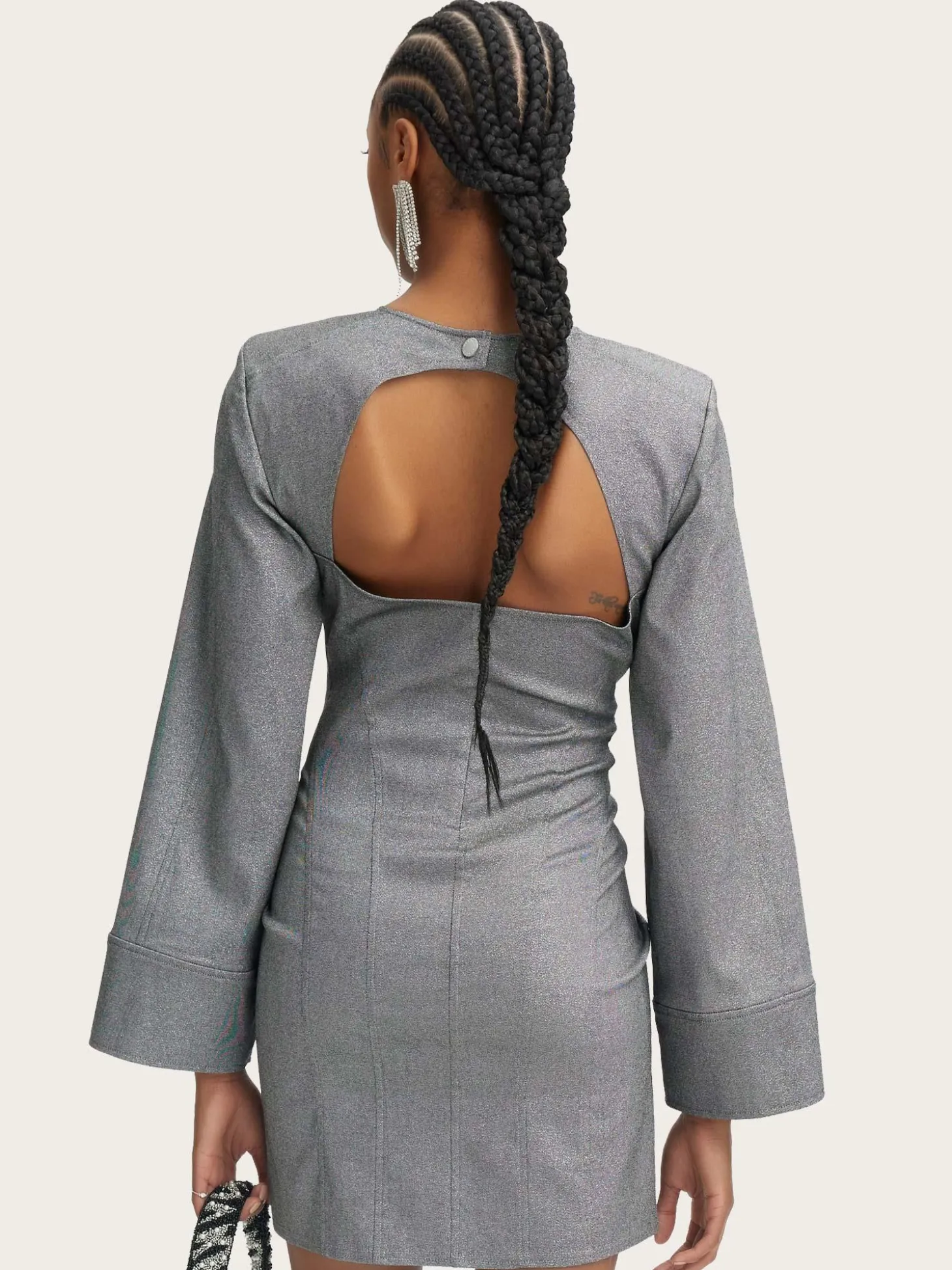 En kul minikjole med sølv-materiale. Den har rund hals med knappelulløn i nakken, åpen rygg og lange ermer. Kjolen er kort og figurnær.