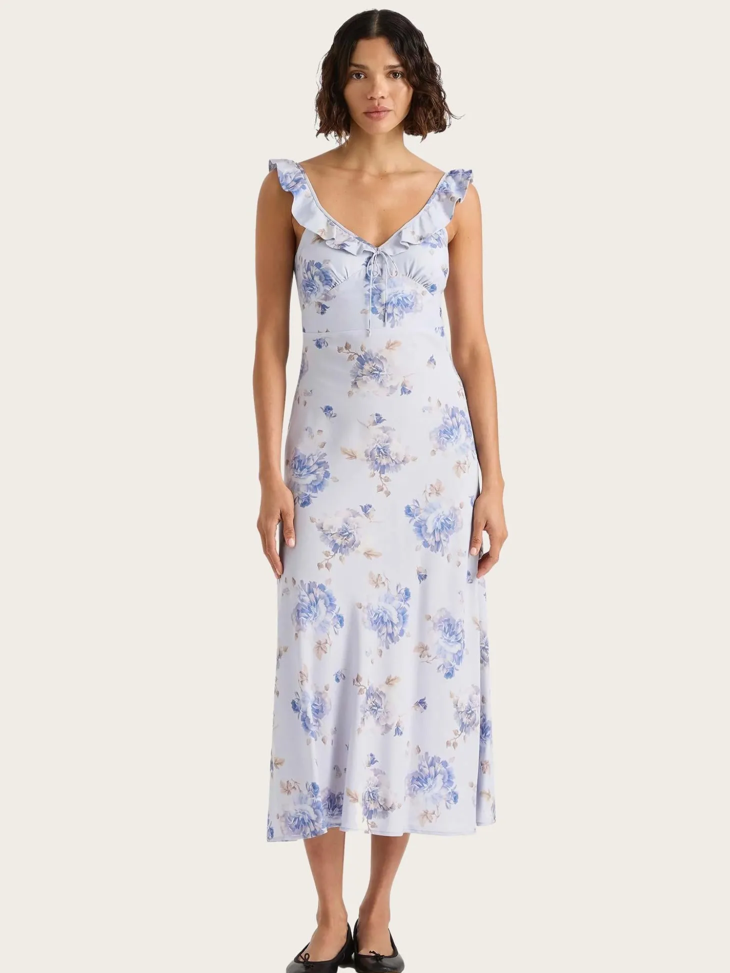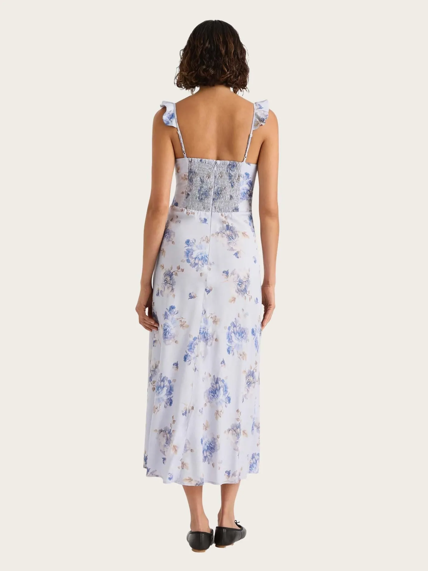 En feminin midikjole med vintage-inspirerte detaljer. Kjolen har en dyp V-hals, tynne justerbare stropper med volangdetaljer og delikate rynker under bysten for en myk, definert passform. Den smale overdelen går over i et lett A-formet skjørt som faller elegant til over anklene. En smockdetalj i ryggpartiet gir ekstra stretch og komfort. Designet i myk rayon med et romantisk blomstermønster i duse lillatoner. Perfekt å style med ballerinasko for en tidløs, feminin look.