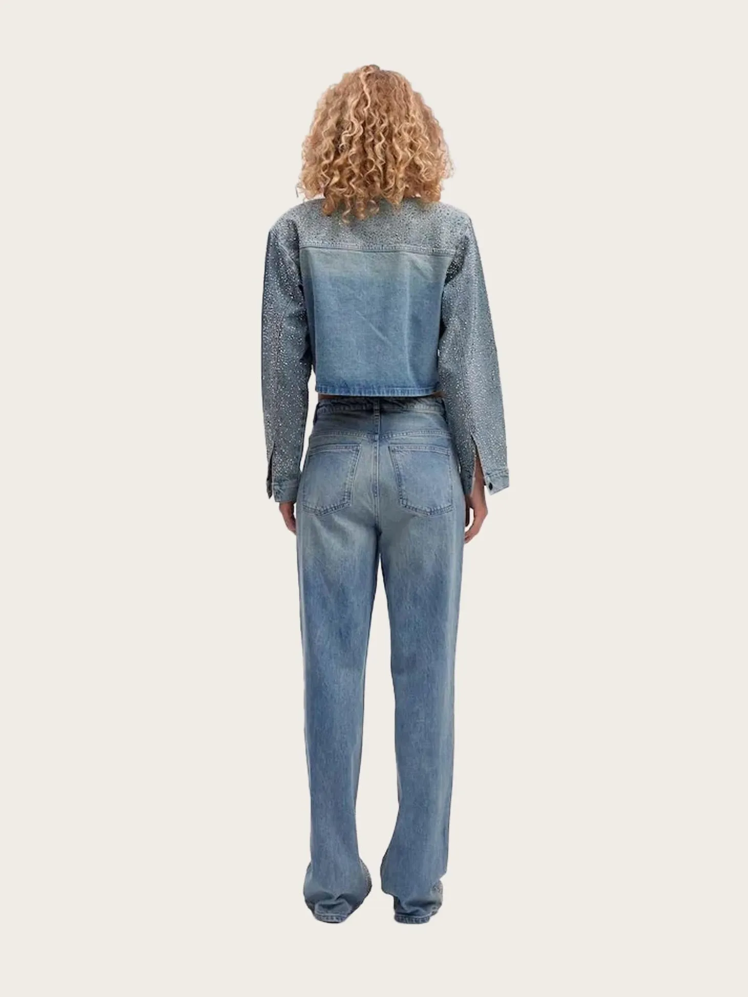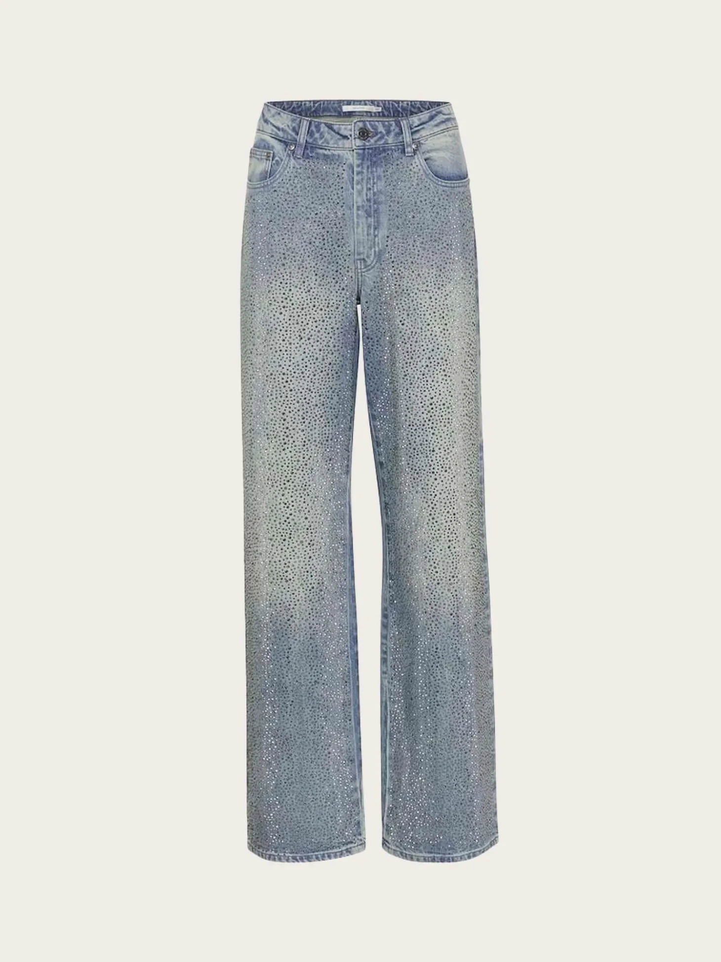 En superkul jeans med strass på fremsiden. Den har medium høyde på livet, og vide rette ben.
