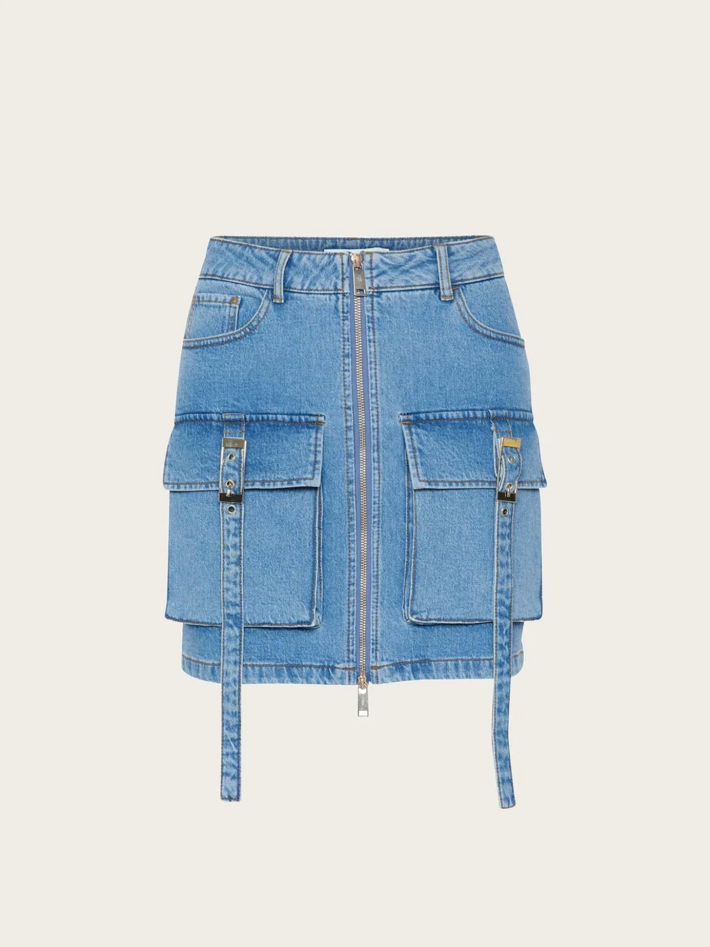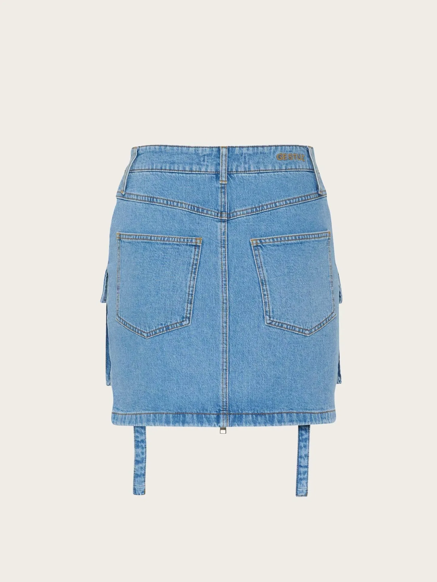 Cargo-skjørt laget av høykvalitets denim. Skjørtet er midwaist, med to store lommer og zip hele veien, for en komfortabel og avslappet look.